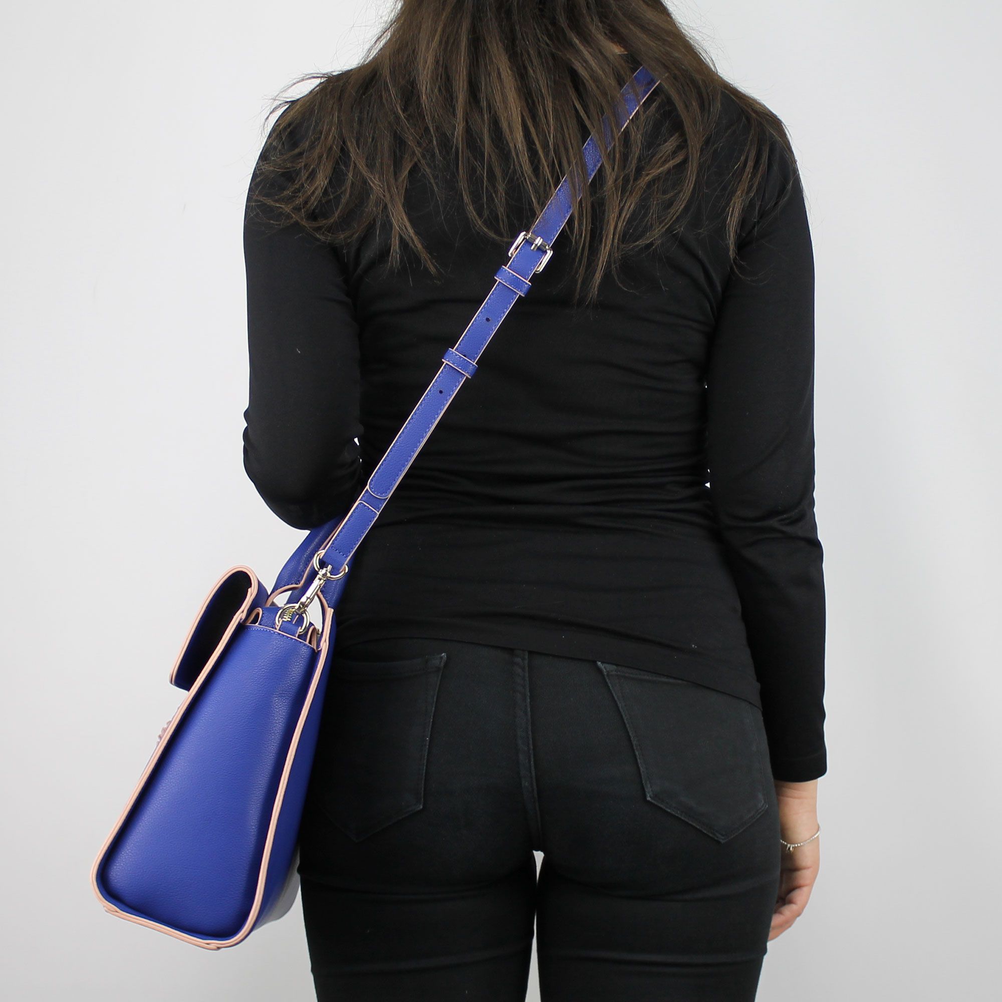 Einkaufstasche-Love Moschino aus kunstleder bottalata blau mit verzierungen in den farben rosa antico. Auf der vorderseite ist eine eingrifftasche auf der port-objekte, geschlossen mit reißverschluss und anhänger bommel in samt-blau und altrosa, versteckt durch eine klappe geschlossen mit einem magnetknopf. Die tasche ist mit einem scomperto, geschlossen, ebenfalls mit reißverschluss, und eine tracollina einstellbar und anwendbar ist, orrorrenza. Logo der marke "Love Moschino" metall wird auf der patte vorne. In kleine staufächer und futter beschichtung kupferfarben. Tasche schützen sie staub enthalten.