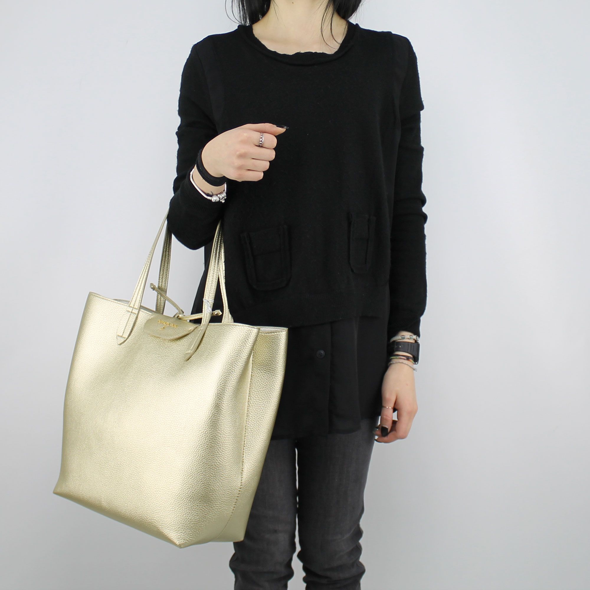Shopping bag hochformat Patrizia Pepe in gold mit perlen. Schriftzug Patrizia Pepe goldenes angewendet auf der vorderseite. Seine inteno verfügt über drei fächer, von denen eine zentral, geschlossen von zip, und eine weitere kleine tasche und das handschuhfach ebenfalls geschlossen durch reißverschluss. Die schale der tasche ist mit zwei kordelzug - verschluss. Die tasche hat in der mitgelieferten tasche schützen sie staub auf den logata Patrizia Pepe.