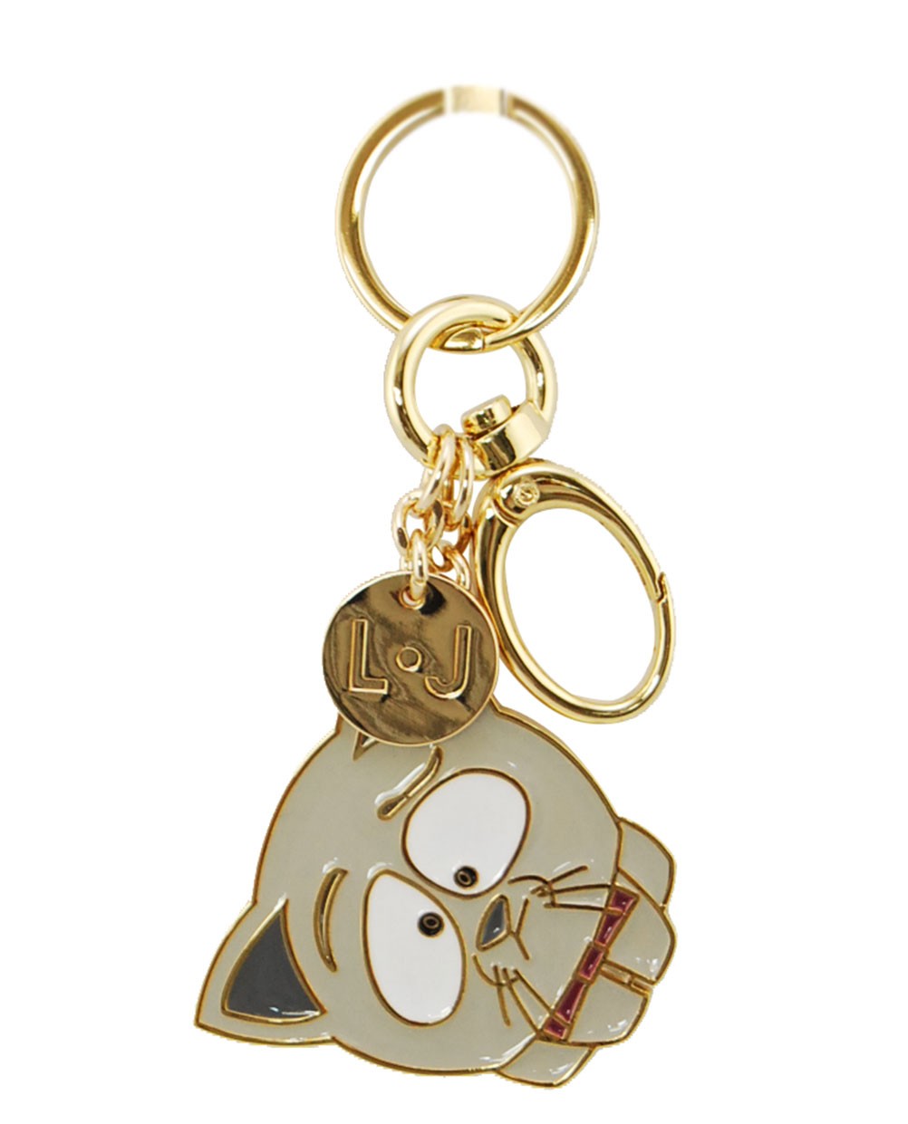 Weißer Liu Jo weird cat-key -, GOLD -, metall-goldene farbe und mit anhänger in form katze, grau, mit fliege rot; Neben den ösen für die schlüssel, präsentiert sich ein praktischer karabiner für die befestigung des schlüsselanhänger.