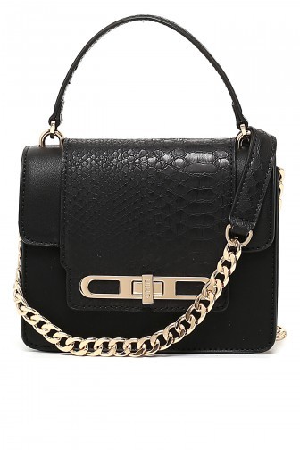 Mini bag-ordner aus kunstleder mit krokodil drucken und schulterriemen mit kette. Schließen mit patte und wanderer angepasst.
