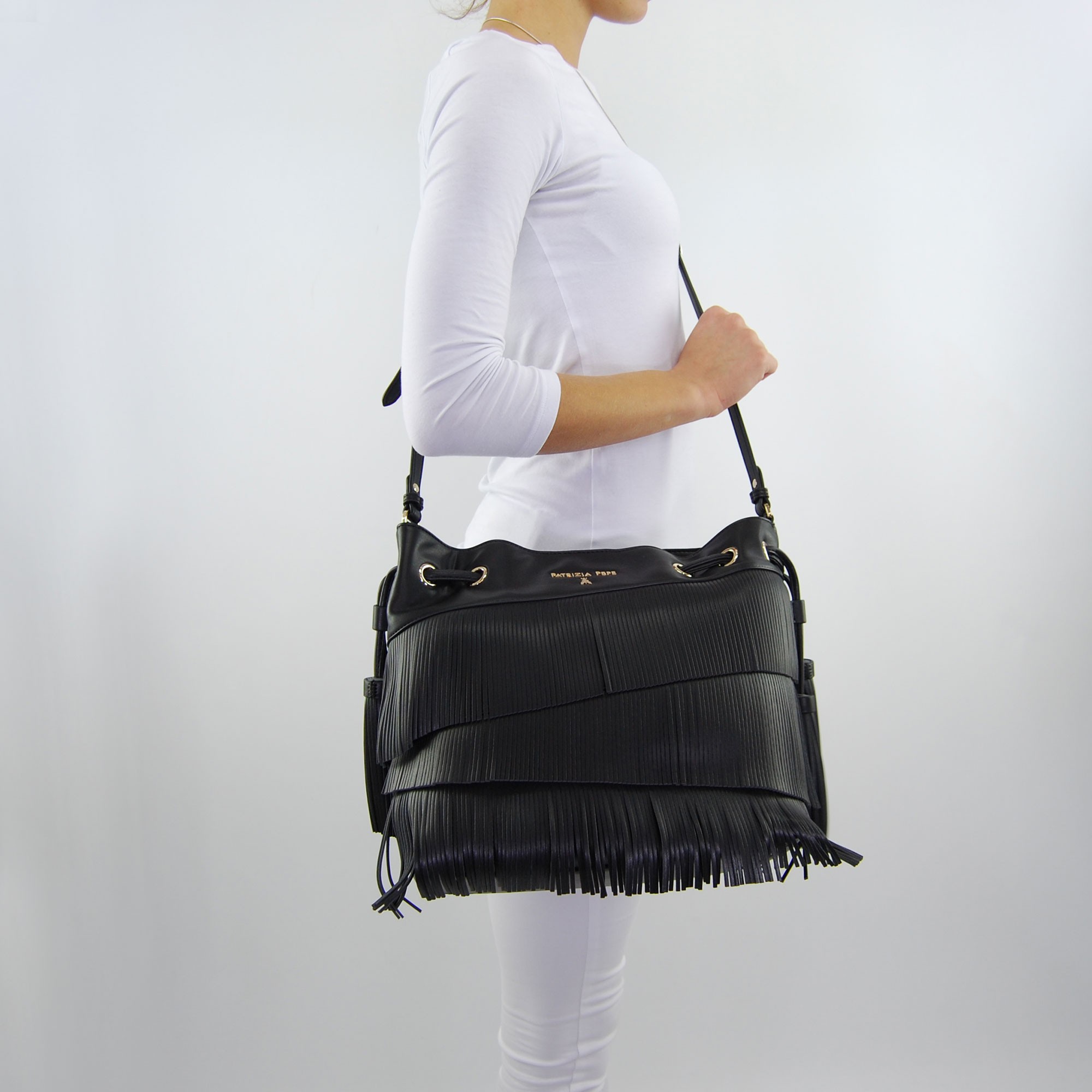 Umhängetasche von Patrizia Pepe groß, aus kunstleder schwarz, verziert in der front-fransen-schwarz und zwei anhänger frangiati an den seiten. Logo patrizia pepe-goldene farbe angewendet. Verschluss mit kordelzug anziehen und magnetknopf. Innerhalb eingrifftaschen verstaut werden. Tasche schützen sie staub enthalten.
