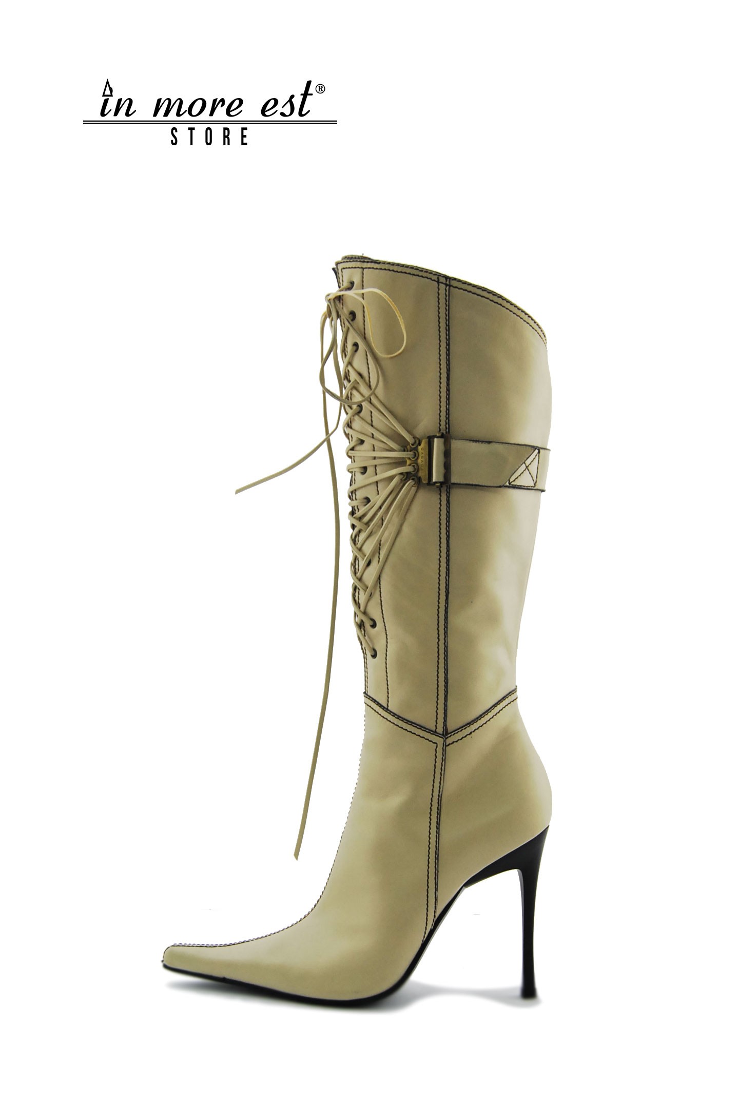 STIVALE ALTO PUNTA PANNA VITELLO GAMBALE ALTO ALLAC GAMBALE E ZIP INTERNAFIBBIA A LACCI SU GAMBALE METAL BRUNITA