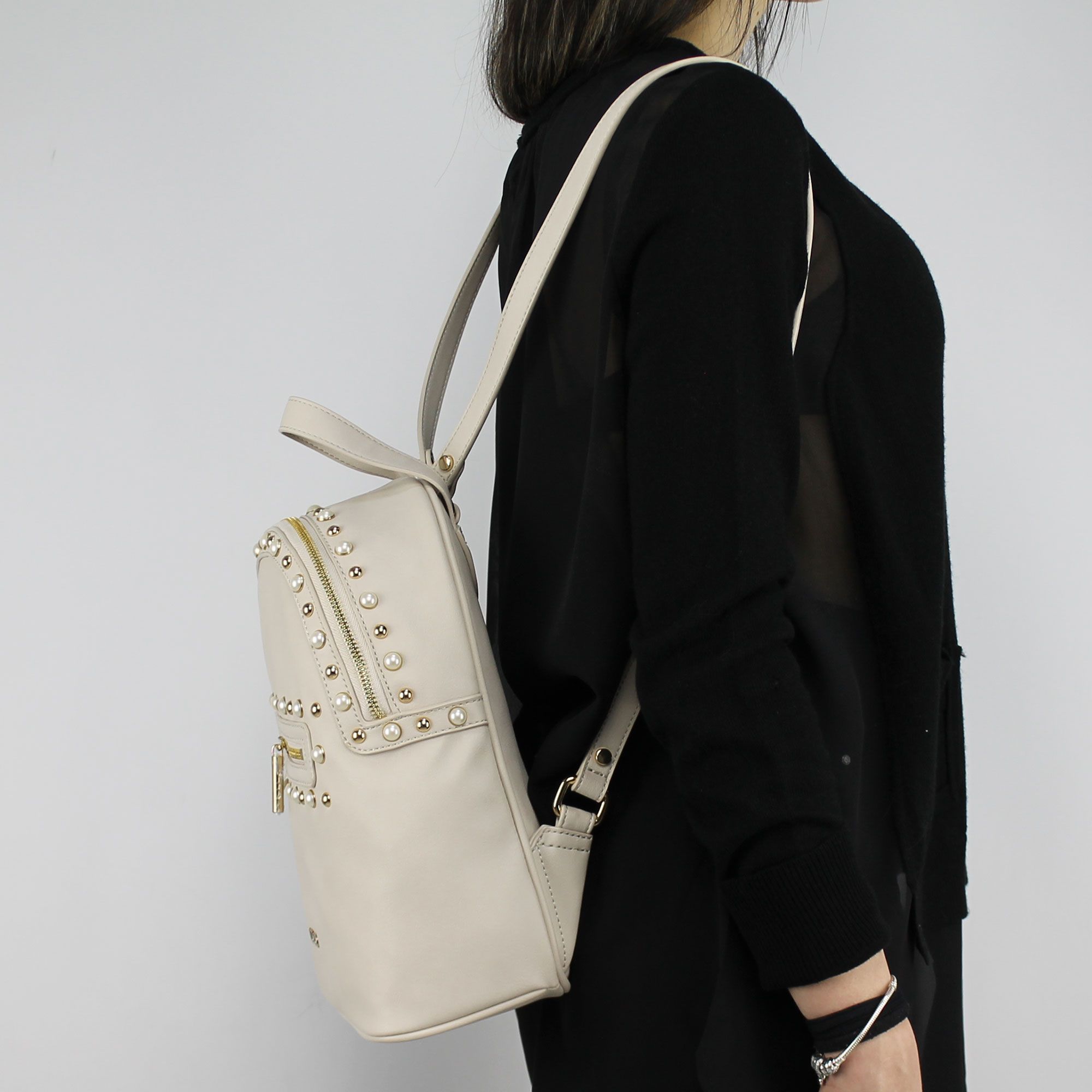 Bag backpack Liu Jo m backpack honolulu leatherette color soy with adjustable straps. Equipped with a main pocket closed with zip and a small pocket for the front also with zip closure in gold color. Application of studs and beading around the zip closure. Inside a small pocket for storage. Inner lining pink. Bag protect dust, including the original.