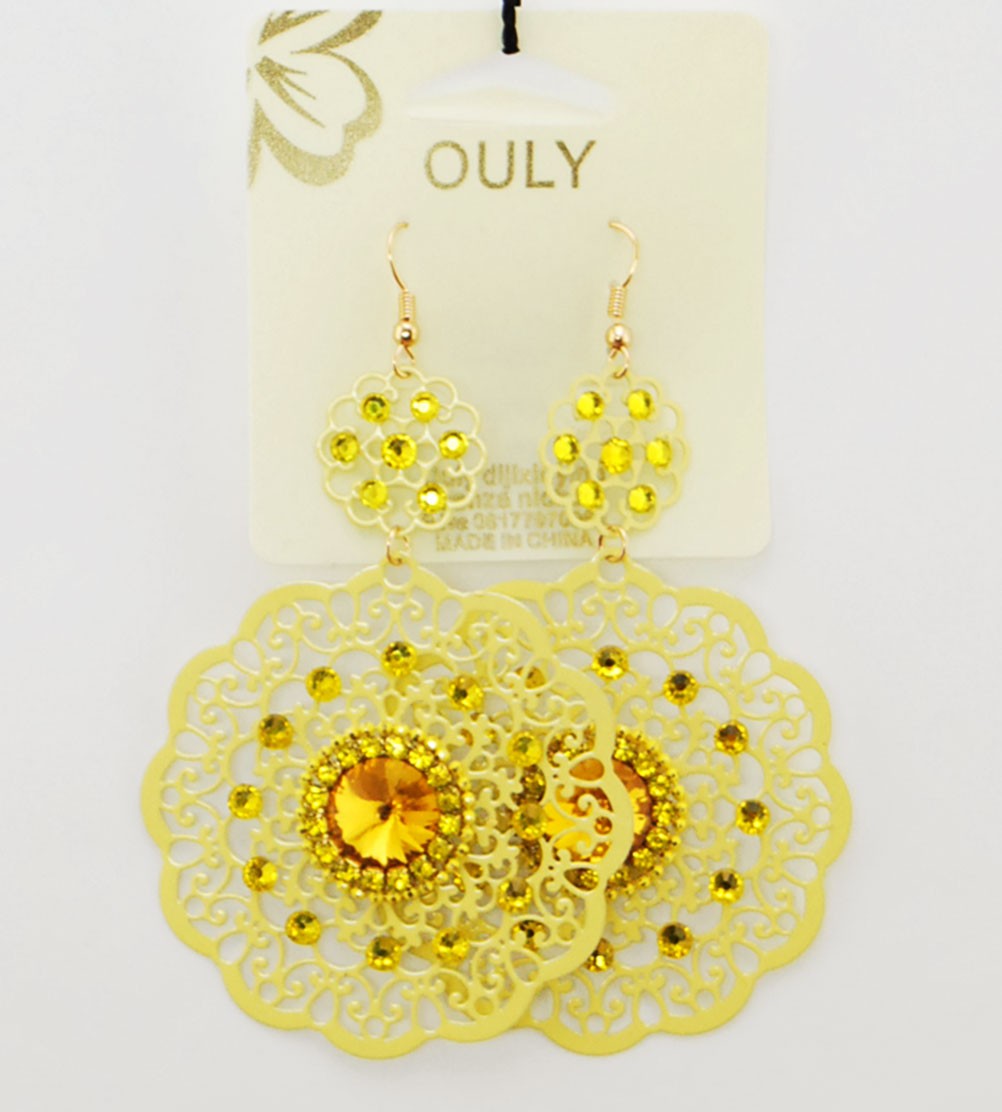 Pendant earrings in metal of yellow color to the decor damask, application rhinestone yellow stone and yellow plastic semi-transparent set in the center.