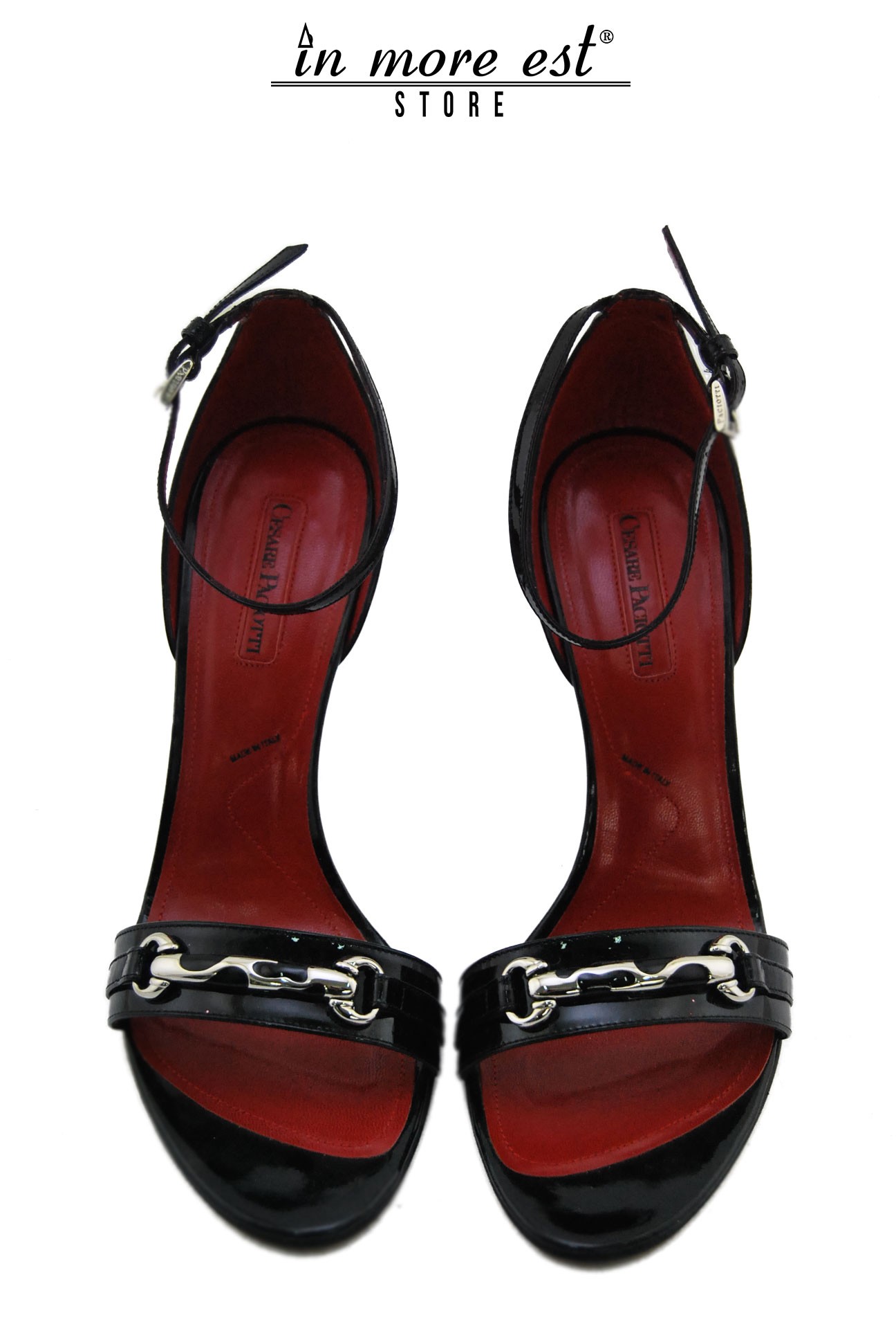 Sandal medium black gloss, finish the edge heel in silver, placchettaargentata with black spots on the wing in front of