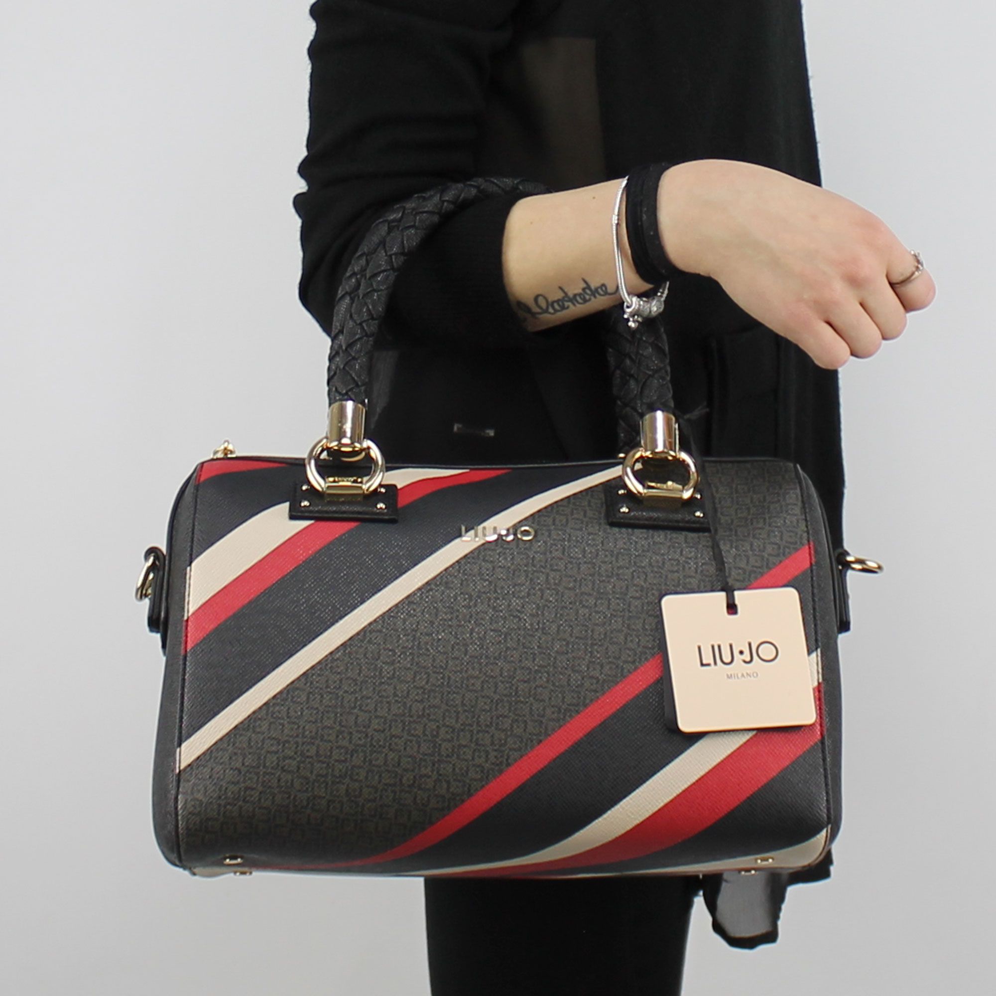 Borsa bauletto Liu Jo m satchel manhattan leather color black and military green, with dual braided handle and removable and adjustable shoulder strap. Single compartment closed by a gold zipper, inside pockets for storage. The Logo of the brand gold color applied on the front. Inner lining in red. Bag protect dust, including the original.