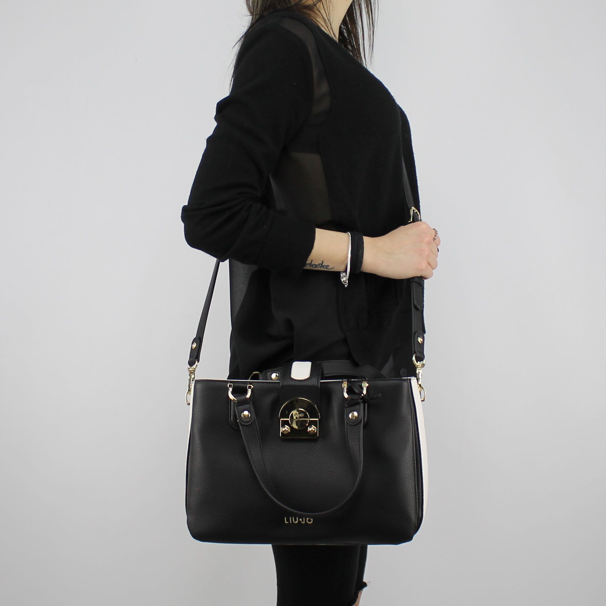 Borsa bauletto Liu Jo black, with double handle and convenient adjustable and removable shoulder strap. The bag has a flap with white and black, secured with hook interlocking logo, which wraps all the compartments on it. Features three different compartments: the first front closed by magnetic button with small interior pocket cell phone holder, one in the middle, closed with a gold zipper, a back is also closed with magnetic button on the inside a small pocket for items door closed with a zip. Brand Logo in metal applied on the front. Lining coating the inner fabric, striped red and cream. Bag protect dust, including the original.