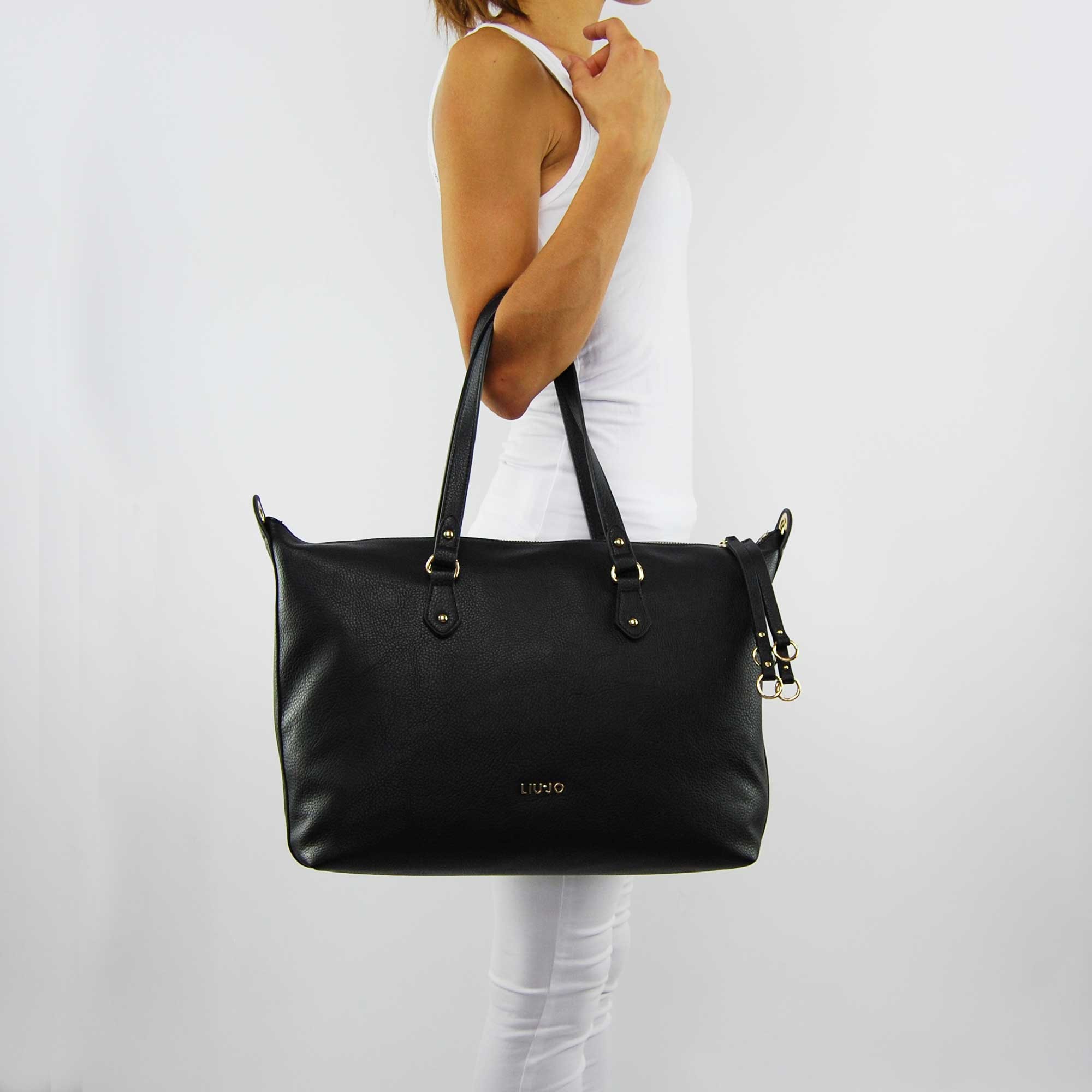 Shopping bag Liu Jo, L eze in faux leather black with removable shoulder strap. Closure zip golden. Logo LiuJo and applications in gold color. Inside small storage compartments. Bag protect dust, including the original.