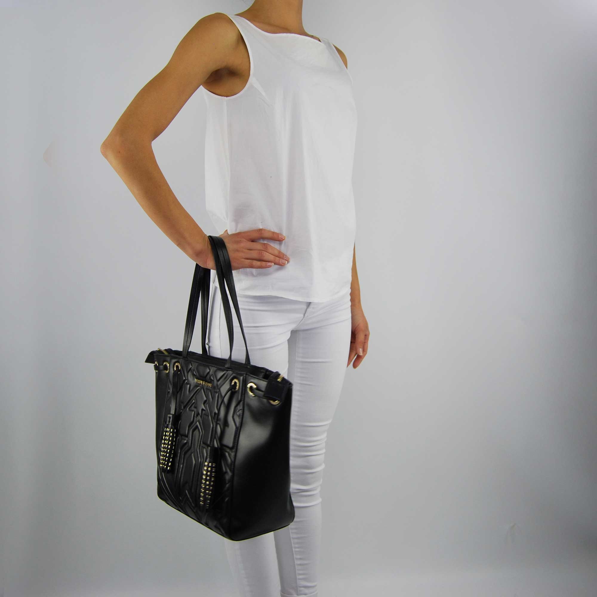 Shopping bag Versa Jeans in black synthetic leather, semi-rigid, equipped with double handle, closure with gold zipper. Has two pandagli feathered in the front. Logo Versace Jeans, and other applications in gold color. The small internal storage pockets, inner lining color black. Bag protect dust, including the original.