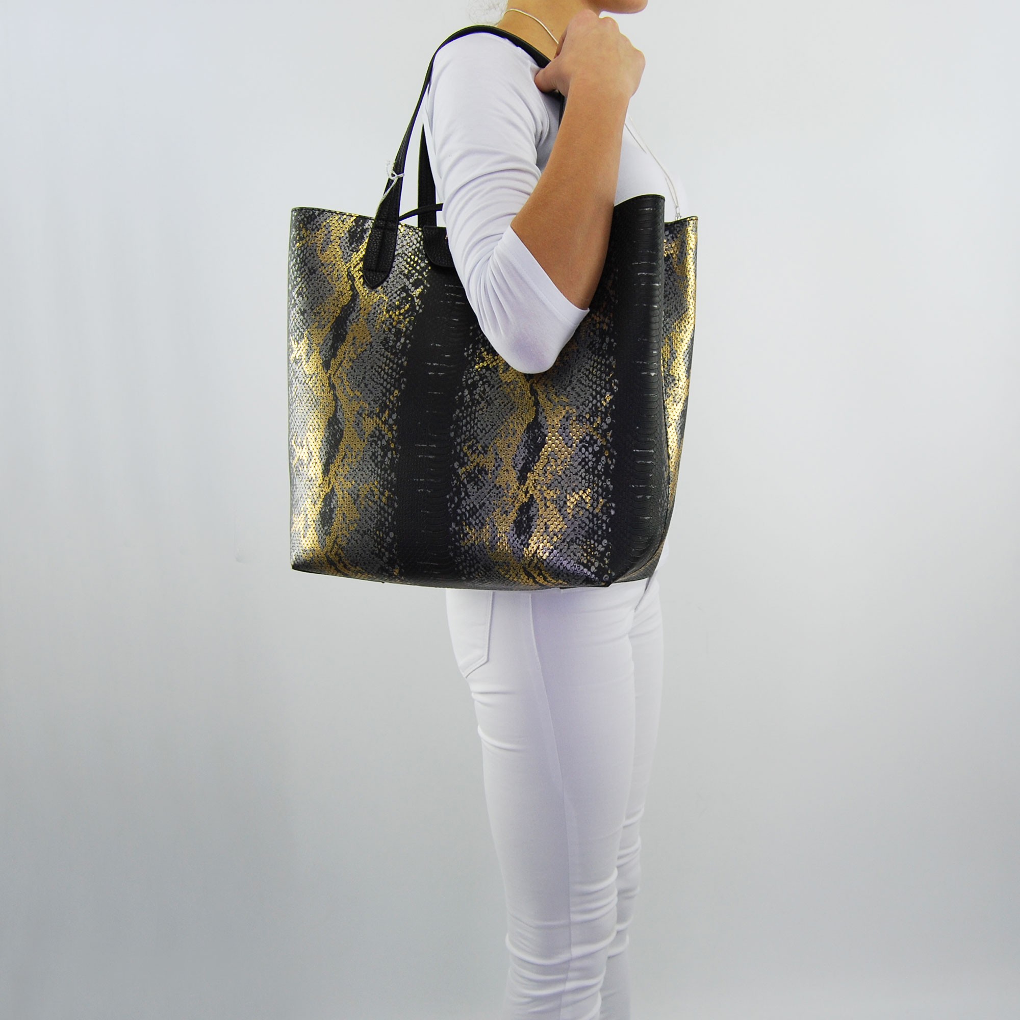 Shopping bag, vertical, Patrizia Pepe with fantasy the python version grey and gold on a black background, and black handle. Patrizia Pepe Logo gold applied in the front part. Inside three compartments, the central one closed by zip, and another small storage pocket also with zip closure. Bag protect dust original included.