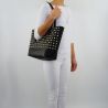 Shopping bag by Patrizia Pepe reversible. Can be worn from the black side with studs and beads, or the black side with studs, flat gold color. Patrizia Pepe Logo applied on the front side. Self-tie closure self-tie wrap closure. Inside there is a maxi clutch bag black removable, with handle and closure zip. Internal pockets for small items. Bag protect dust, including the original.
