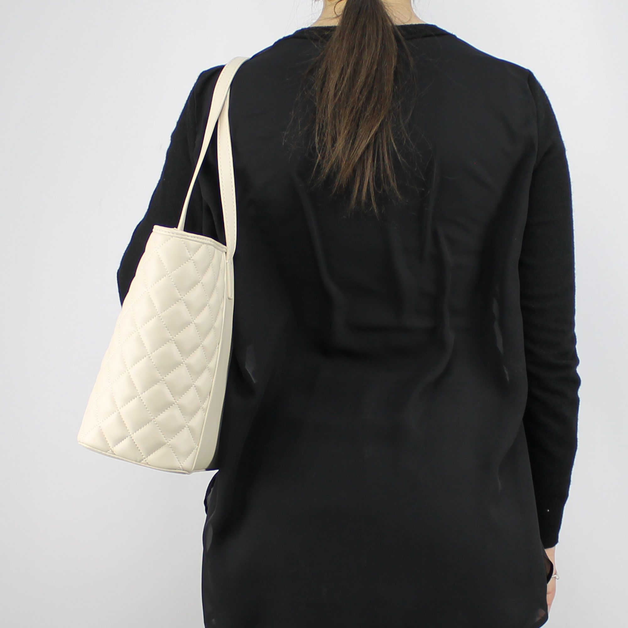 Shopping bag Love Moschino leather ivory. The bag has a smooth fabric on the front and back side, and a fabric with a quilted effect on the sides. It is equipped with a flap which can be closed inside with a hook interlocking. The Logo of the brand and golden applications. Inside lining coating with copper tones and a small pocket for storing small items. Bag protect dust, including the original.