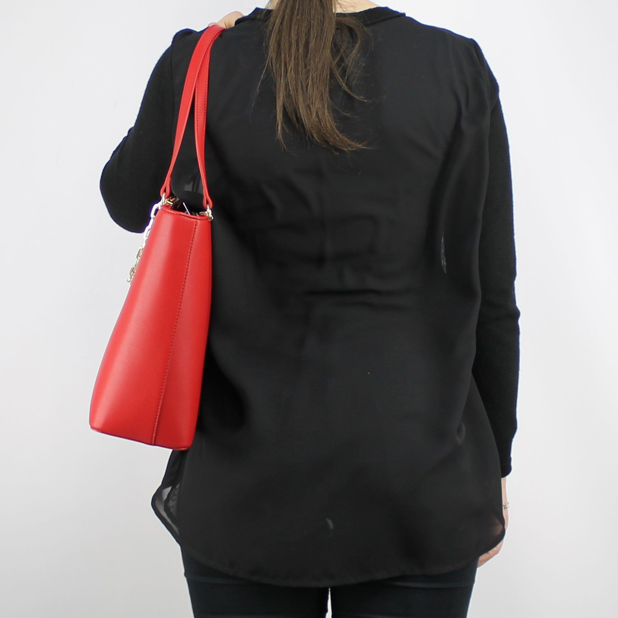 Shopping bag Love Moschino leather red. In the front side there is the logo of the brand metallic gold, and a necklace, also golden, attached to the sides of the front handle. The shopping, closed with a zip, has an internal small organiser pockets, and a lining coating in tessutio black. Bag protect dust, including the original.