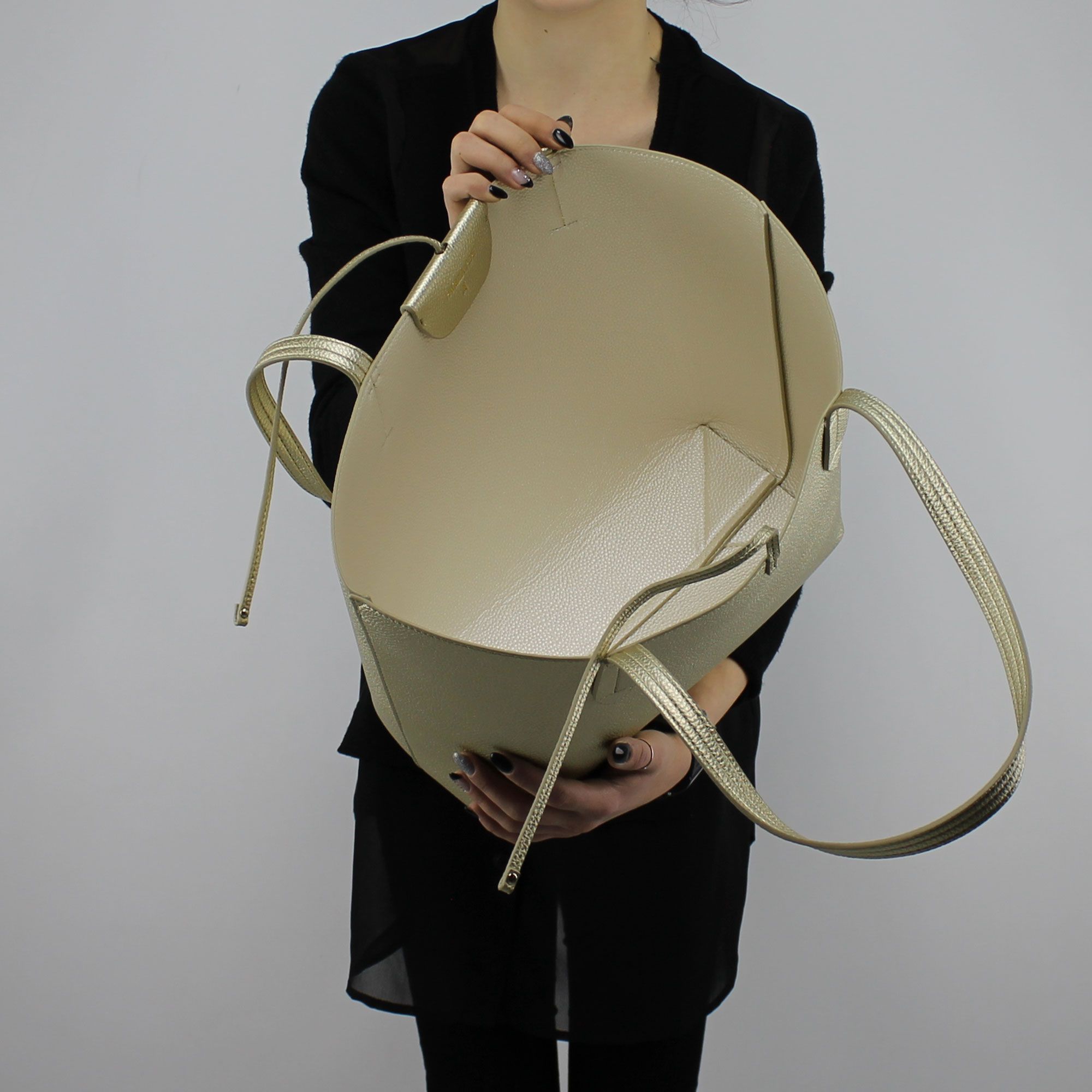 Shopping bag by Patrizia Pepe faux leather gold reversible pearl. This shopping can be worn from both the side and total gold side of pearl handles with gilt. Inside there is a pouch with zip and safety cord with snap-hook allows the hook to the body of the bag, and guaranteeing the union. The inner bag, in addition to having this use, it can also be used as a second bag, and wear it on your shoulder thanks to the safety cord that attached to the appropriate loop becomes a convenient shoulder strap. The inner bag has small pockets, one with zip. The main bodywork has two straps to tie to the external closure. The brand logo is applied in front of both the color-variants-of-use.The bag is supplied with a carry bag protect dust the original with the printing of the logo Patrizia Pepe.
