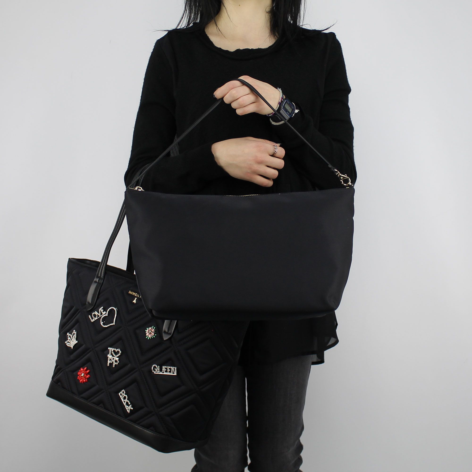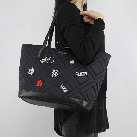 Shopping bag by Patrizia Pepe in technical fabric, black quilted, characterized by the presence of brooches jewel removable. Inside there is a bag in technical fabric with zip closure and safety latch with a spring that allows the hook to the body of the bag, and guaranteeing the union. The inner bag, in addition to having this use, it can also be used as a second bag, and wear it on your shoulder thanks to the safety cord that attached to the appropriate loop becomes a convenient shoulder strap. The inner bag has small pockets, one with zip. The main bodywork has two straps to tie to the external closure. Lettering Patrizia Pepe metal applied on the front side. Inserts and handles made of black artificial leather. The bag is supplied with a carry bag protect dust the original with the printing of the logo Patrizia Pepe.