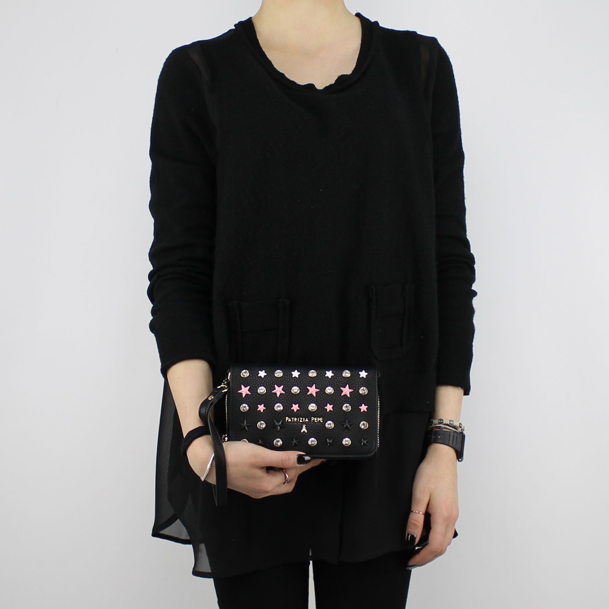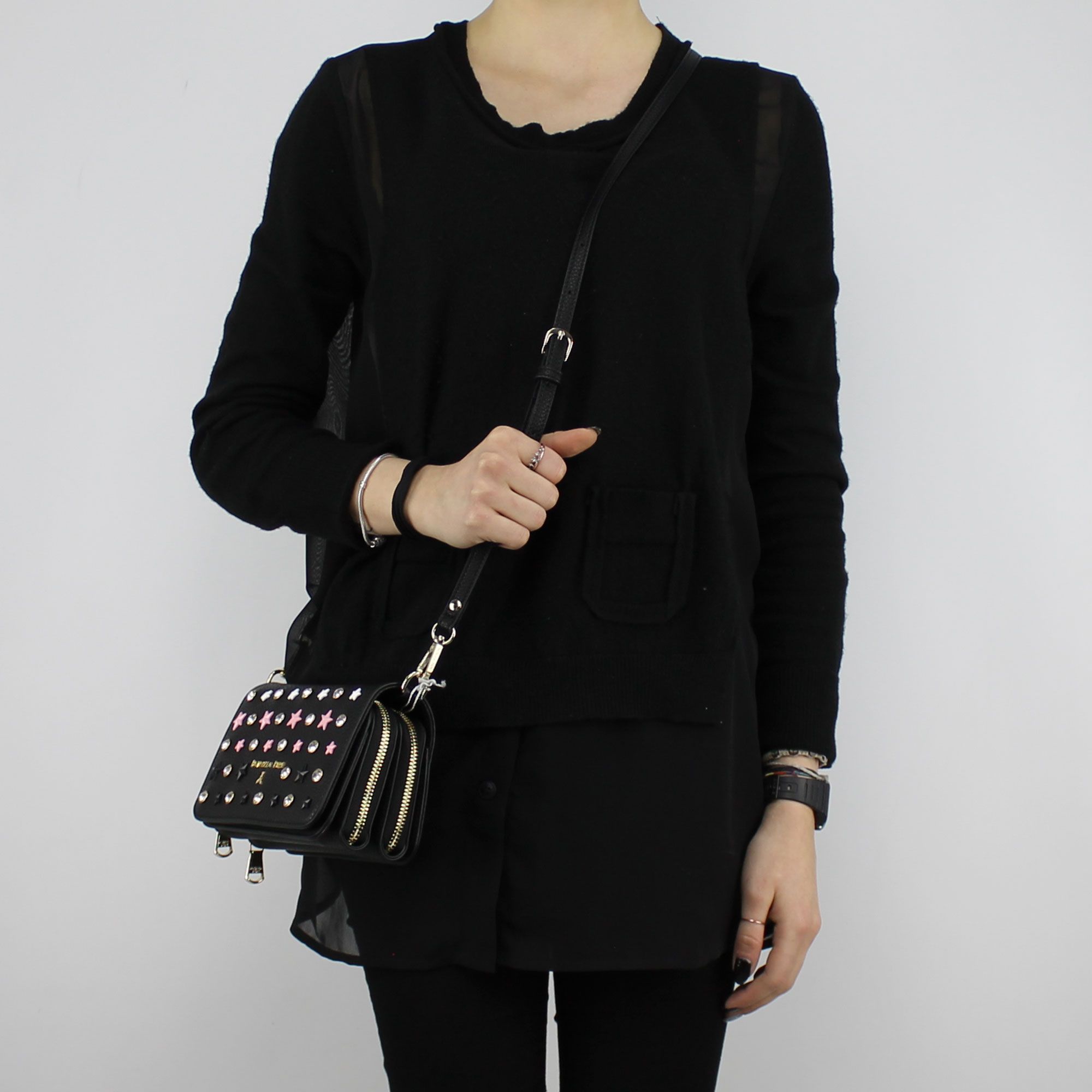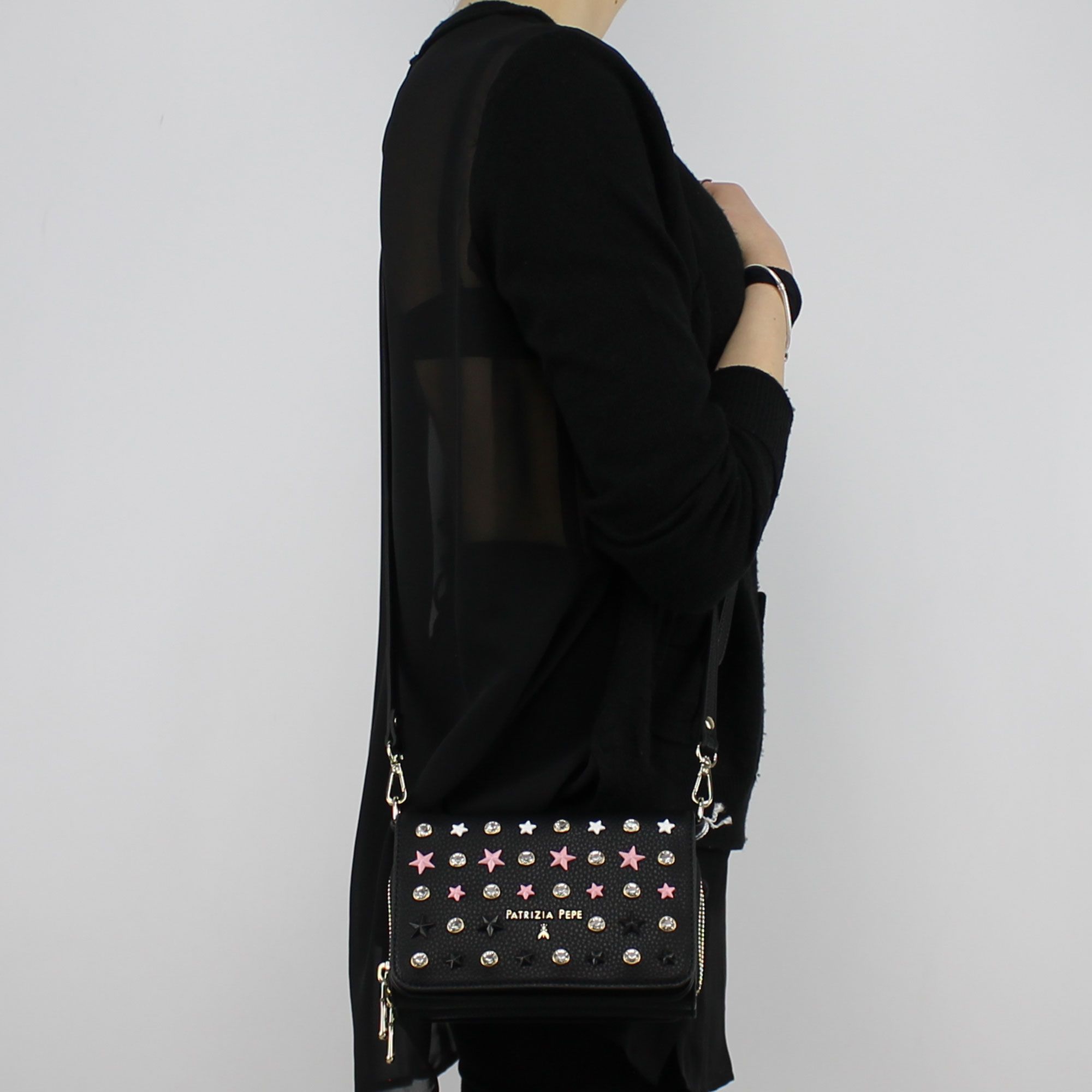 Shoulder bag Patrizia Pepe in black eco leather with studs and rhinestones. The front part of the tracollina in addition to having the logo metallic golden Patrizia Pepper, is embellished with studs, rhinestones and studs, star-shaped white, black and pink of different sizes. The shoulder strap has the flap closure and magnetic button and inside four compartments, two of which are closed by zip. The shoulder bag is usable or on your shoulder thanks to the shoulder strap included (adjustable length), both as a clutch with or without the wrist strap. The bag is accompanied from bag protect dust the original with the printing of the logo Patrizia Pepe.
