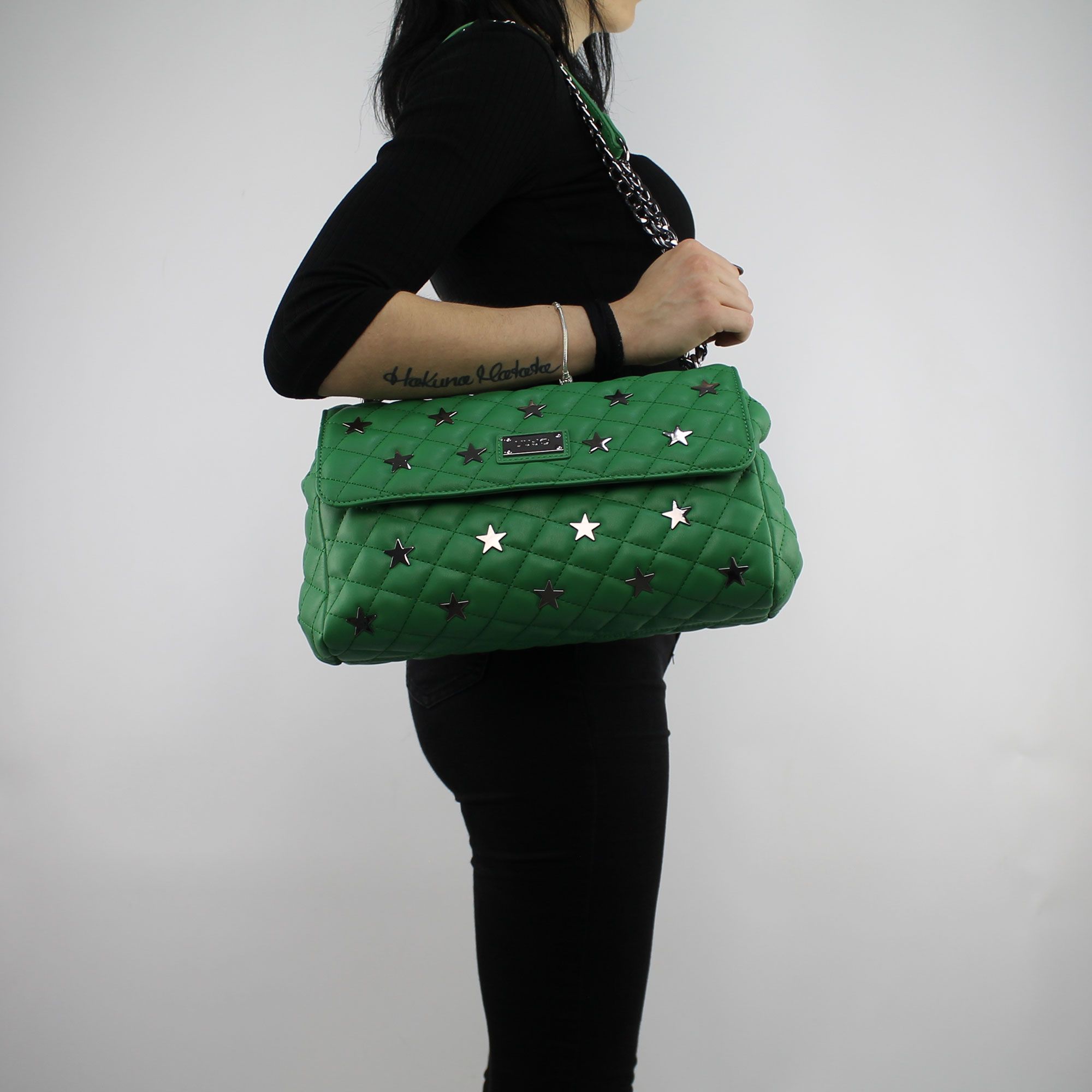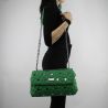 Shoulder bag m crossbody california electric green, faux leather quilted with application of metal studs in the shape of a star of color the barrel of the rifle. The shoulder strap is equipped with a shoulder strap metallic coloured studs and a stretch leather-look black; The shoulder strap is adjustable in length by using the slider in the mounting rings that allow you to use the shoulder in more ways than one. On the inside there is a compartment well large, covered in lining electric green and two internal pockets for objects, one with zip closure. The main compartment is asked by the flap main the coupling. On the front flap is applied, the metallic logo Liu Jo. Equipped with the bag to protect dust and original logo.
