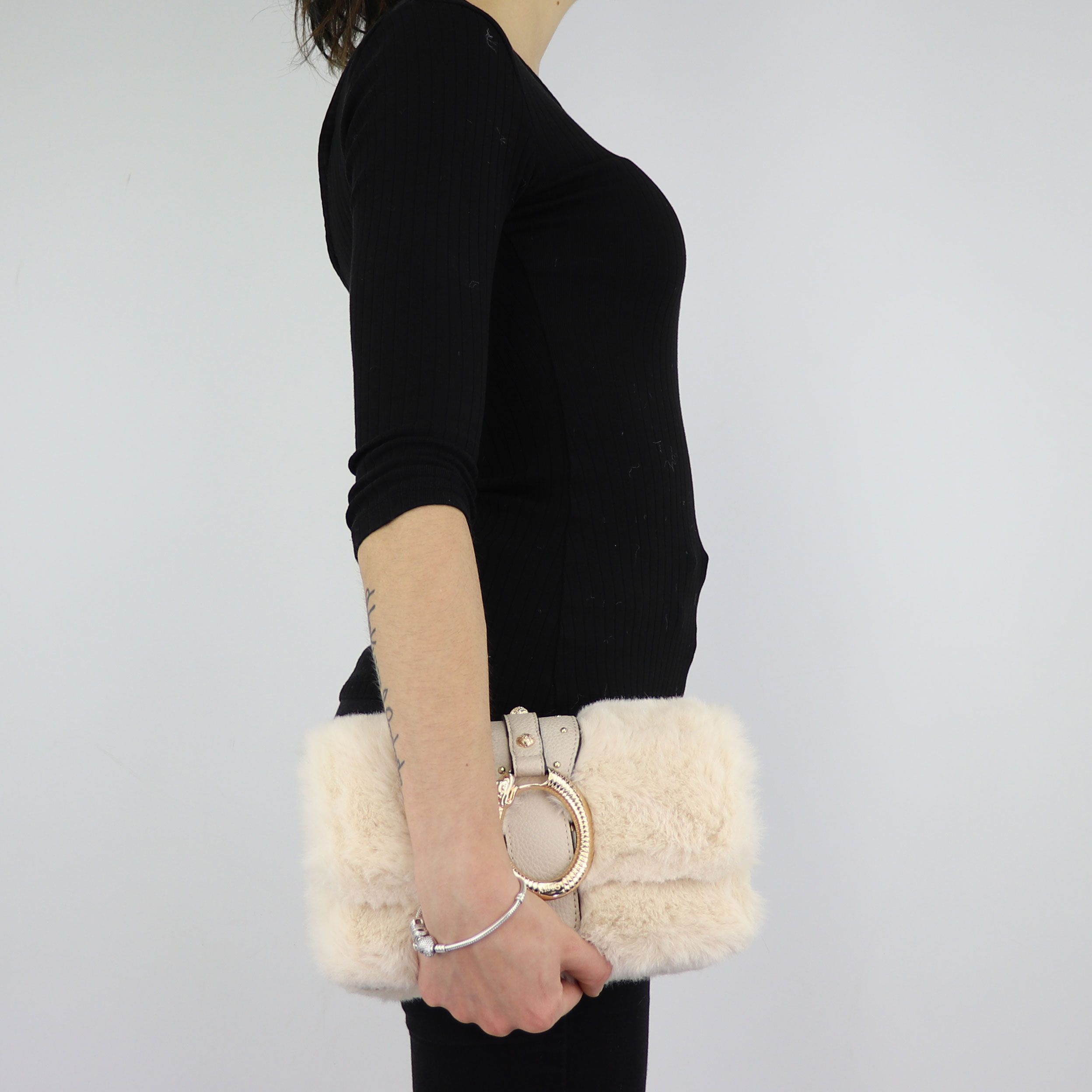 Hand bag and shoulder strap Liu Jo soy in fake fur and imitation leather effect tumbled. The bag from the elegant design and the original is coated with a soft synthetic fur color soy. The front flap features the application of micro-studs, golden sands of different sizes, but what makes it even more sophisticated and elegant is the representation of a serpent above the magnetic button closure. The bag has a single compartment and an adjustable shoulder strap and removable to pleasure. The lining the lining inside is fabric color antique pink. Lettering the logo of the brand is applied down on the back in gold metal. Bag protect original dust included.