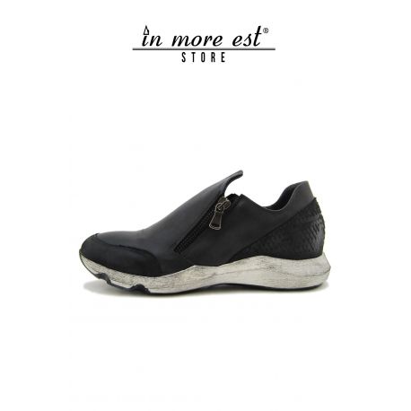 Sneaker low-black calf leather, tallonme of reptile leather black, double zip, bottom in white rubber