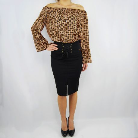 Blouse Everis fancy-colored, copper-plated patterned black. Boat neckline with elastic, 3/4 sleeve with elastic and ruffle. Soft fit.