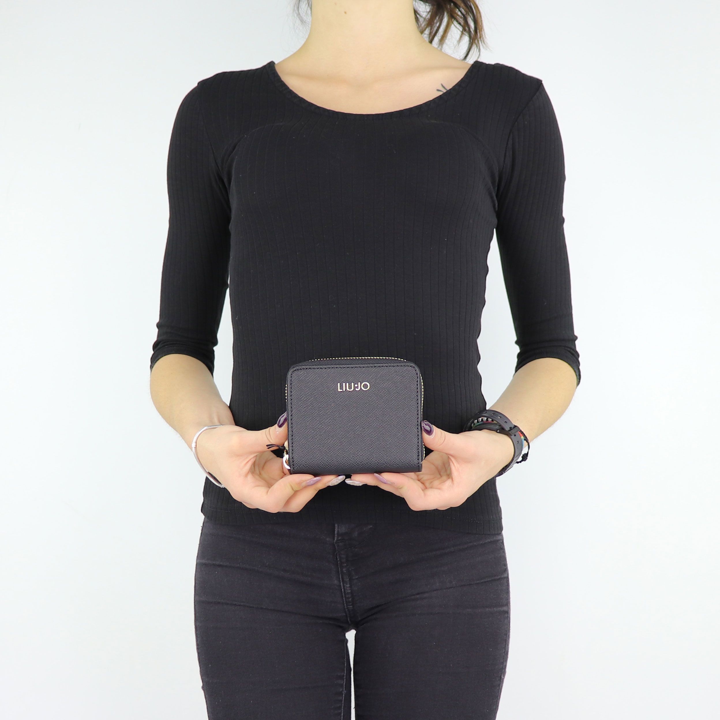 Wallet Liu Jo black leather effect rough with gold zipper. The portfolio inside has a pocket for coins secured with button clip, a department of the port for banknotes with lining coating gridded effect on scottish and pockets for cards and documents. Logo Lettering Liu Jo gilded metal positioned in front of the top. The item is sold with original box.