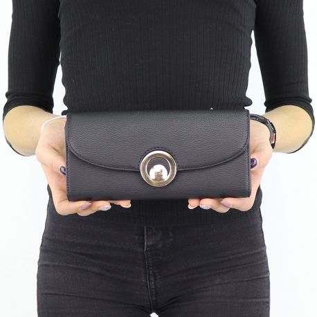 Cartera de Liu Jo de cuero negro efecto de lana, se pude cerrar con el botón presión. La cartera de presentar con solapa de cierre y botón a presión, adornado con un inserto de metal dorado en la forma de un círculo con un grabado de la el logo de la marca. En el interior tiene dos grandes compartimentos: uno para el puerto de billetes en euros y los documentos, y el otro un bolsillo de la moneda asegurado con una cremallera. El revestimiento que cubre el interior es de tela negro. En la parte trasera tiene un bolsillo con un estuche de python cerrado en oro con cierre de cremallera y extraíble en el placer, de acuerdo a sus necesidades. Logotipo De Letras Liu Jo dorado de metal ubicado en la parte posterior de. El artículo se vende con en caja original.