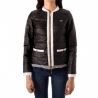 Abajo chaqueta recortada Liu Jo Deporte negro con tapizado en algodón. La peculiaridad de este la chaqueta son sin duda el blanco y rayas multicolor y en blanco y negro presente por todo el perímetro. Cierre con cremallera y metal dorado logo aplicado en el pecho. Pequeños bolsillos orizzonatali colocan en la parte delantera, también decorado con banda blanca, y se cierra con botón a presión con logo.