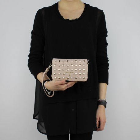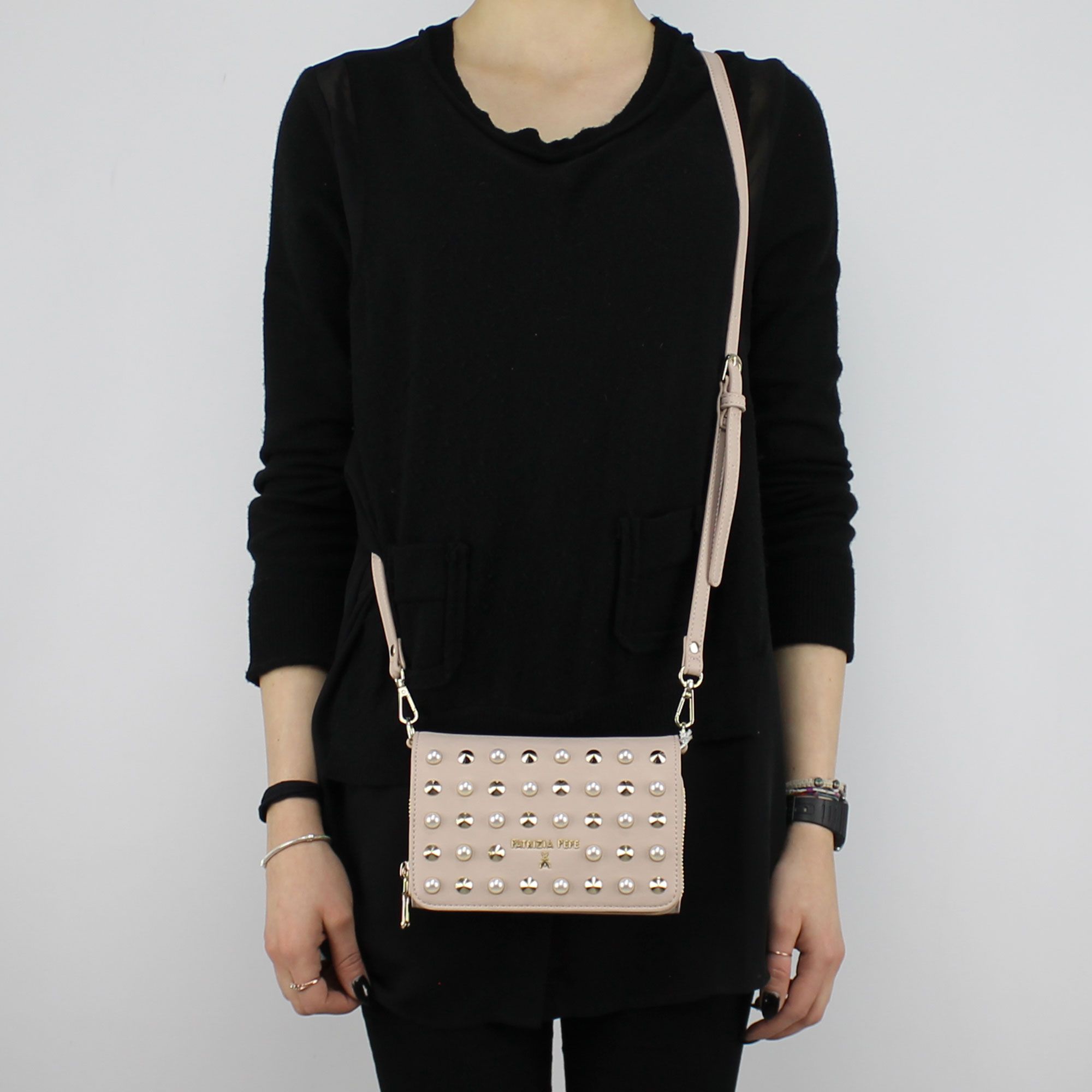 Bolso de hombro, Patrizia Pepe de cuero en color rosa con postes de madera y perlas. La parte frontal de la tracollina además de tener el logo de metal dorado Patrizia Pepe, está adornado con tachuelas de metal, clavos de oro con perlas en blanco. La correa de hombro tiene la solapa de cierre magnético y botón, y dentro de cuatro compartimentos, dos de los cuales están cerrados por cremallera. La bolsa de hombro puede ser usado tanto en el hombro gracias a la correa de hombro incluida (longitud ajustable), tanto como un embrague con o sin la correa para la muñeca. La bolsa se suministra con una bolsa de proteger del polvo de la original con la impresión del logotipo de Patrizia Pepe.