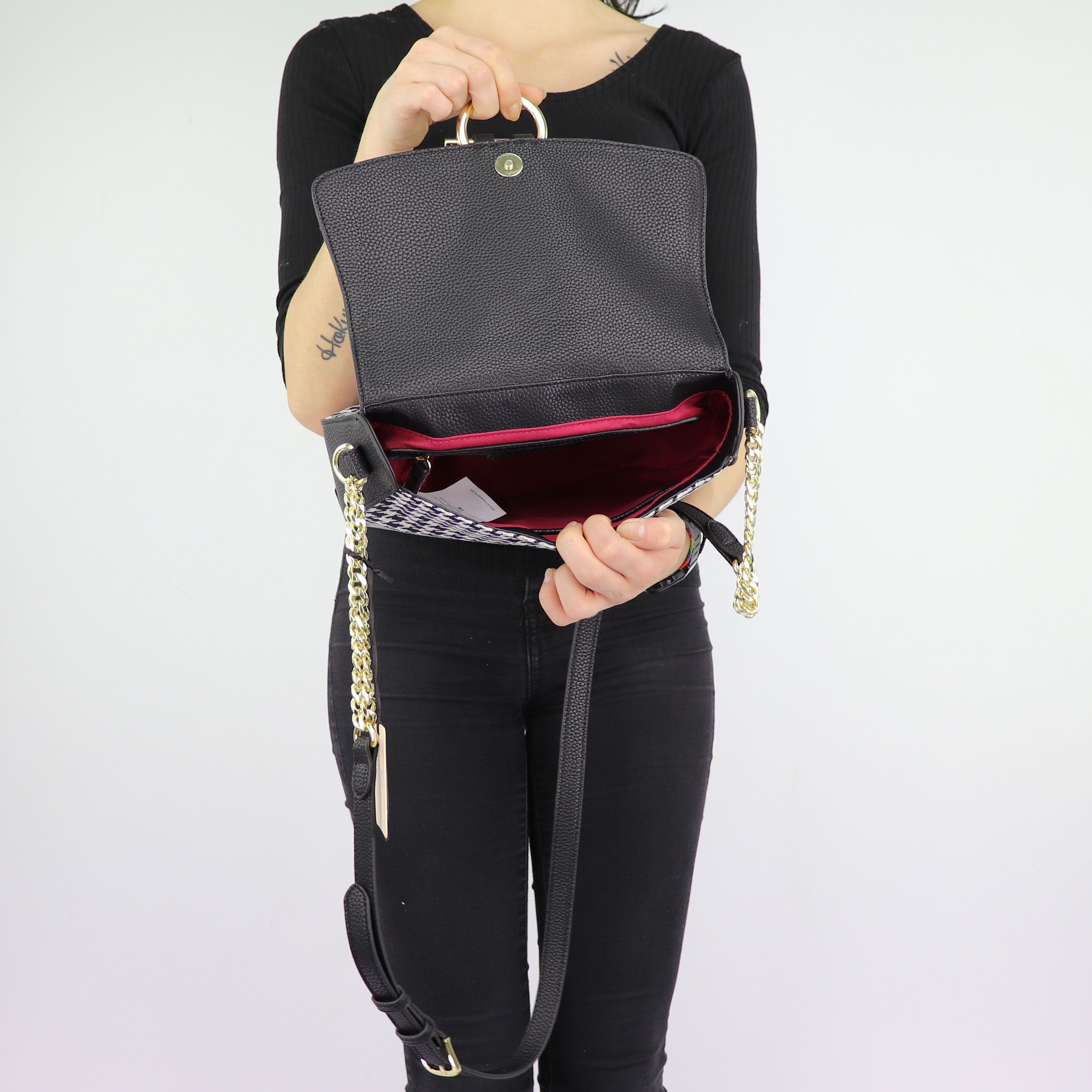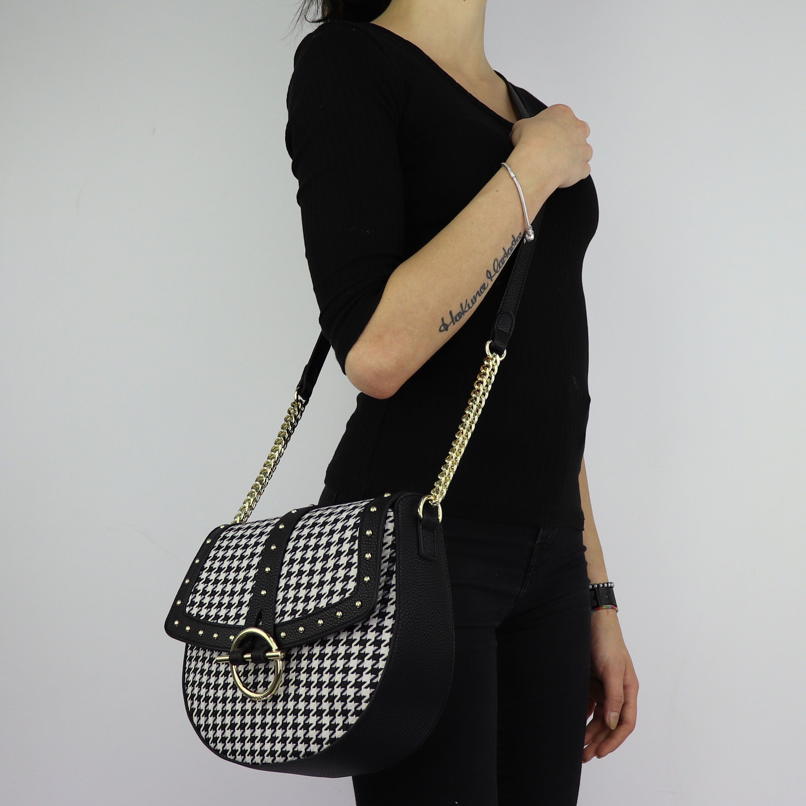 Bolso de hombro de Liu Jo, el pied de poule está hecha de una tela y cuero falso inserta. La correa de hombro del estilo vintage y muy chic, que está protegida con solapa con botón magnético en el que se colocan micro tachuelas en dorado metal, inserciones de tejido pied de-poule de color blanco y negro y de imitación de gancho que embellece aún más el de la bolsa. En el interior hay un cómodo compartimento con tapa tela de color azul, y prácticos bolsillos, uno de ellos se pude cerrar con una cremallera. El Logo de la marca en el metal dorado impreso hacia los lados. Bolsa de proteger del polvo original incluido.