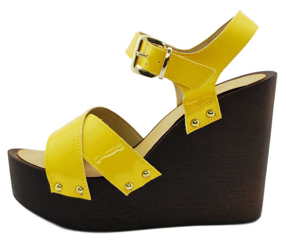 Cuña sandalia abierto en pintura de color amarillo, las bandas en la intersección en la parte posterior del pie y correa en el tobillo en pintura de color amarillo con una hebilla de oro; la parte Inferior de la madera ligera brown y clavos metálicos de oro por encima de la piel en contacto con la madera.