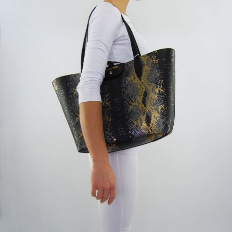 Bolsa de compras por Patrizia Pepe reversible negro. Puede ser ha sido usado por el lado negro o desde el lado con la fantasía de la versión de python sobre un fondo negro, con juegos la luz dorada, tiradores, color gris. Patrizia Pepe Logo aplicado en la parte frontal. Cierre auto-cierre de lazo auto-lazo cierre de wrap. En el interior hay un maxi bolso de embrague con desmontable asa y cierre de cremallera. Bolsillos internos para guardar objetos pequeños. Bolsa de proteger del polvo el original incluido.