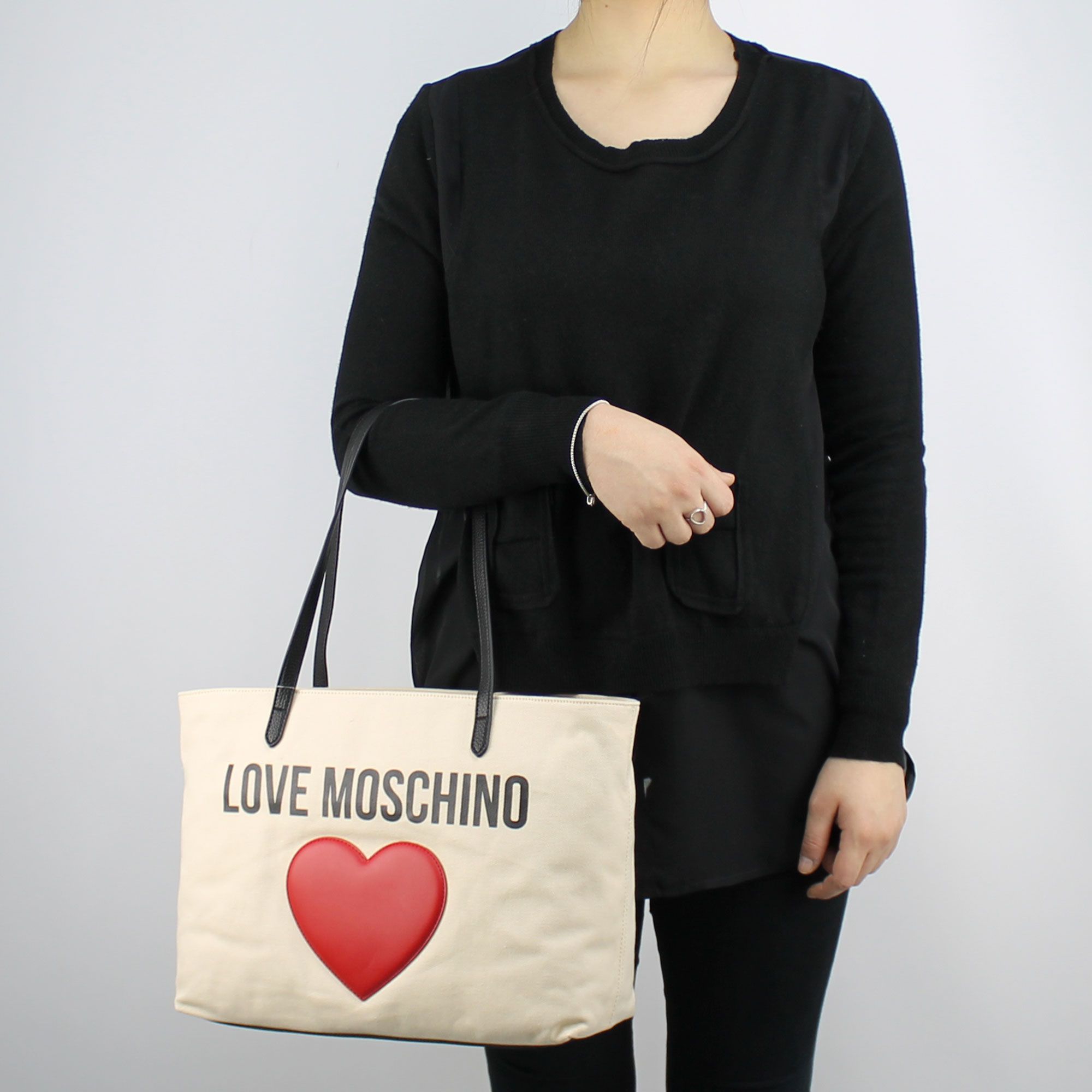 Bolsa de compras de Love Moschino marfil tela y aplicaciones en cuero artificial. En la parte frontal se aplica un corazón rojo, que caracteriza de forma única la de la marca, y encima el logo de "LOVE MOSCHINO". La tienda está equipada con una cremallera y en el interior tiene un pequeño bolsillo para objetos. Forro interior en tela de cobre. Bolsa de proteger del polvo, incluyendo el original.