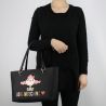 Bolsa de compras de Love Moschino de imitación de cuero negro se desplomó y cierre en oro con cierre de cremallera. Frontal aplicaciones de parches en la forma de una muñeca y un escrito multicolor "Love Moschino", el logotipo de la marca de metal. Los pequeños bolsillos de almacenamiento interno y forro forro rojo. Bolsa de proteger del polvo, incluyendo el original.