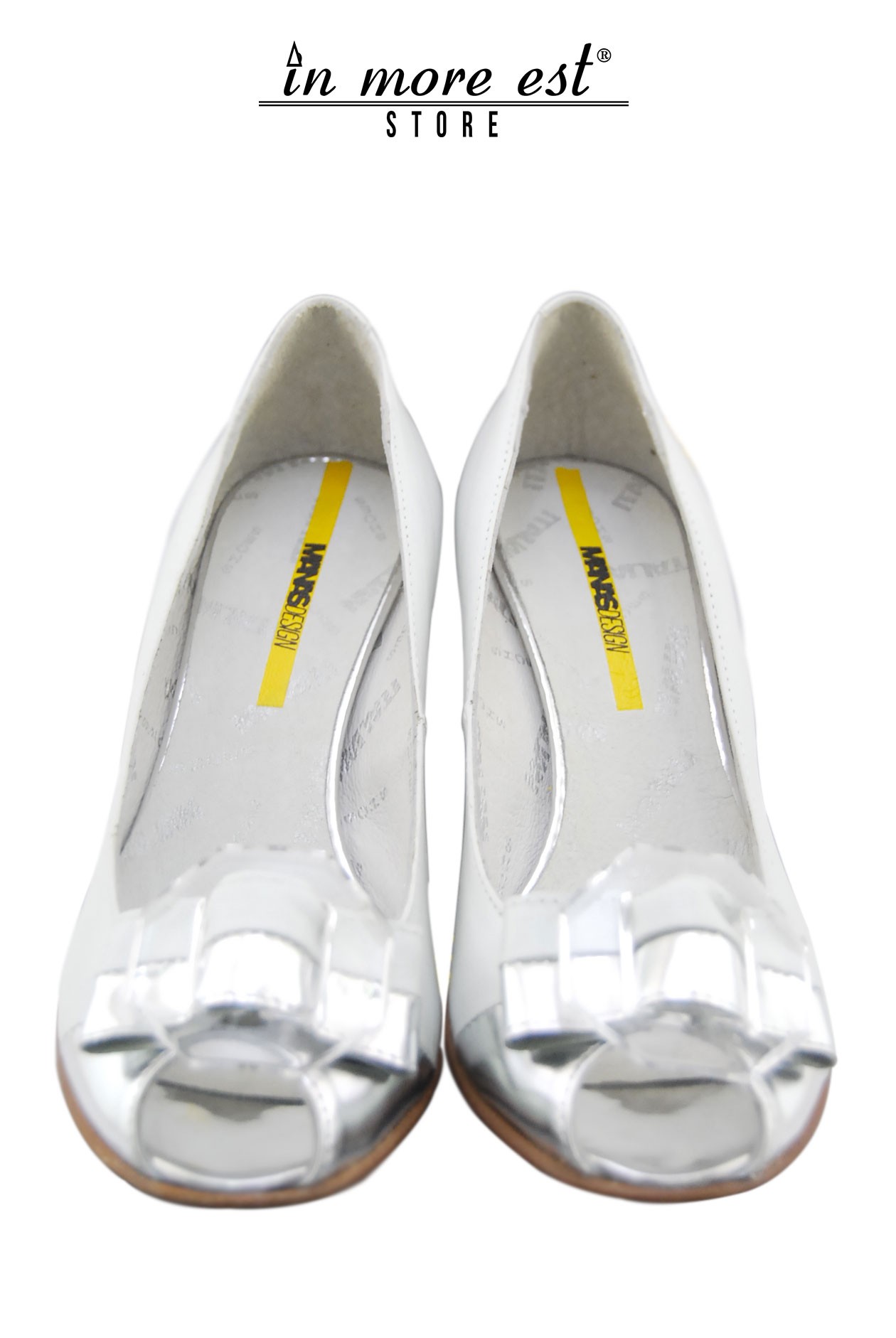 Escote' baja de cuero de becerro blanco, placa, metacrilato transparente, con arco