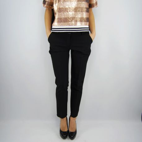 Pantalones de Everis negro de corte masculino, con bolsillos verticales. Lazada con cierre de cremallera y botón.