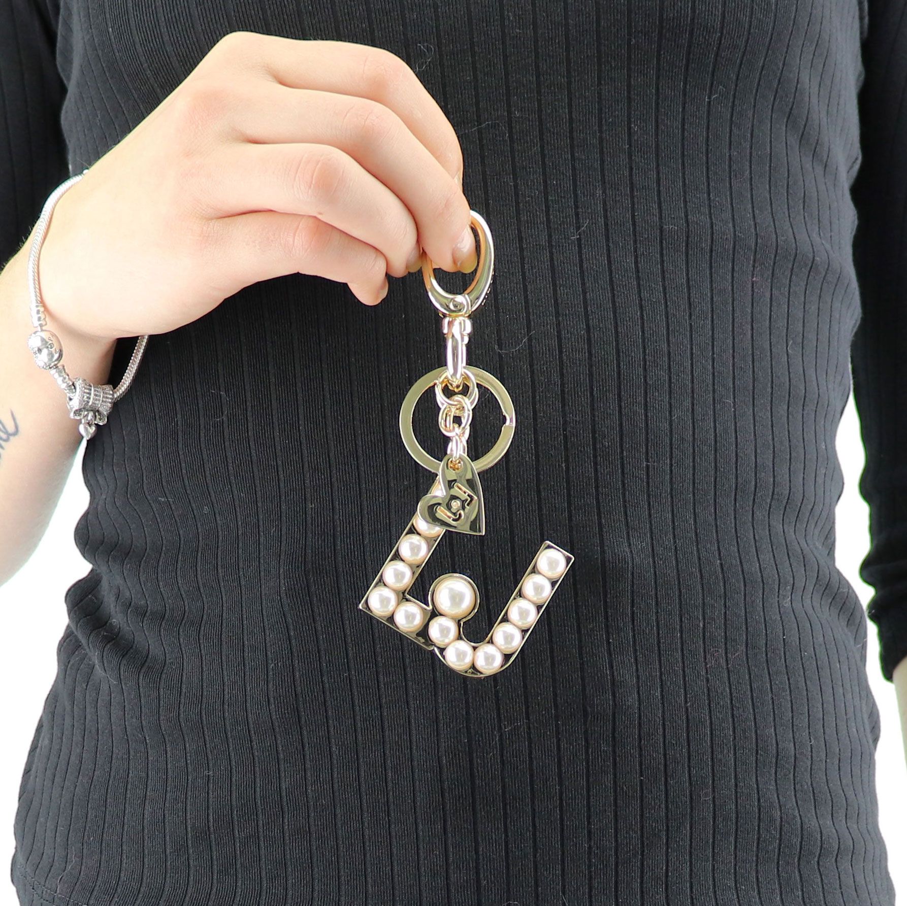 Portachiav Liu Jo en metal de oro con las iniciales de la marca y las aplicaciones de elegante las perlas de ellos. Además de tener un ojo para las llaves, y cuenta con una conveniente mosquetón para la fijación del anillo de claves. Ideal para ser aplicado en las manijas de su favorito de las bolsas o para utilizar como llavero. Bolsa de proteger del polvo original incluido.