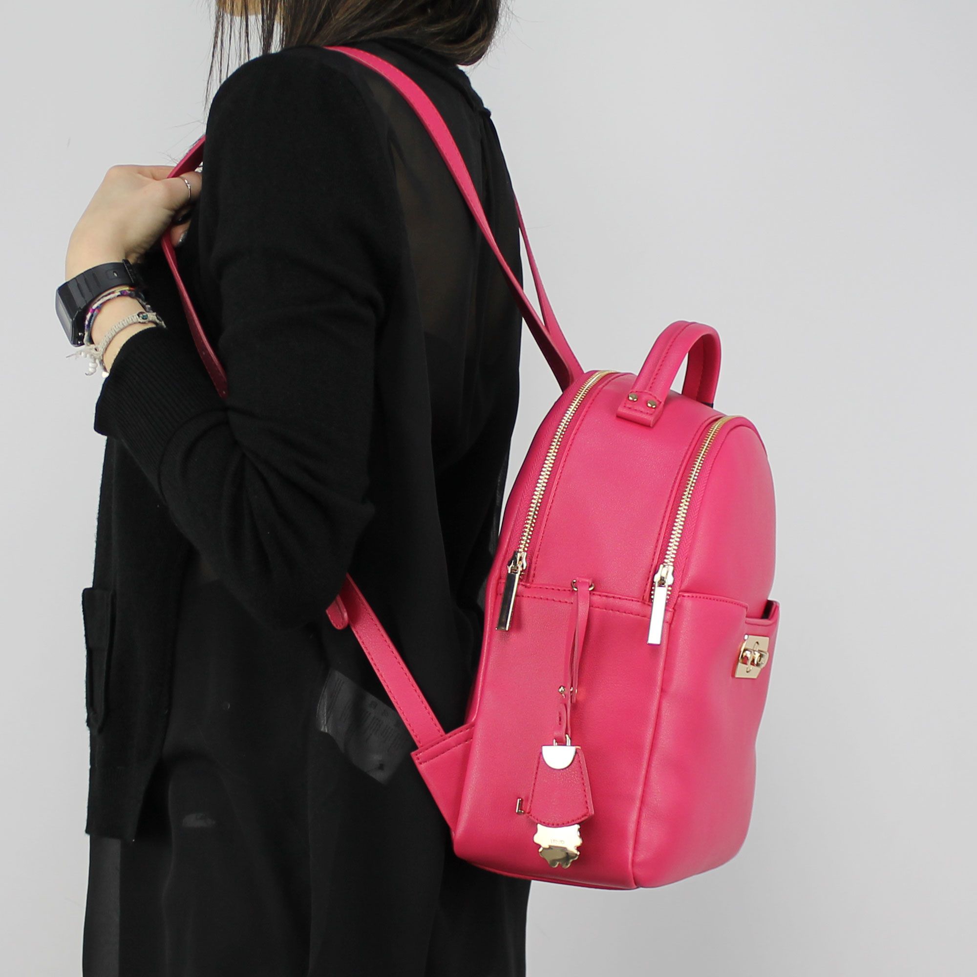 Bolsa mochila de Liu Jo de imitación de cuero del color de la cereza tiene correas de hombro ajustables y cómoda asa en la parte superior. La mochila está dividido en dos compartimentos cerrados por cremallera dorada y tiene un pequeño bolsillo delantero, guantera cerrada con botón con logo de ajuste. Dentro de los bolsillos de guante de forro y revestimiento de tela-cereza de color. El Logo de la marca de oro conectada a un lado y grabado en los accesorios de la bolsa. Al lado de la mochila hay un colgante con un trébol de cuatro hojas metálicas de oro que pueden ser removidos a voluntad. Bolsa de proteger del polvo, incluyendo el original.