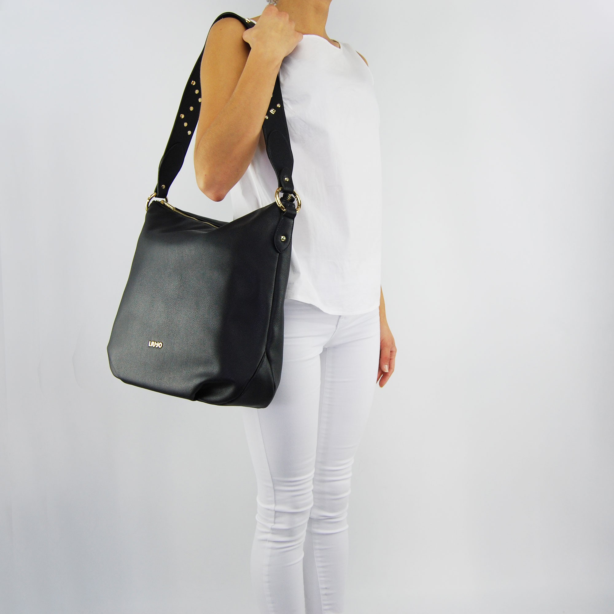Bolsa de Liu Jo m angers en cuero sintético negro, con correa de hombro desmontable. Presenta la solicitud diamantes de imitación y los tacos dorados a lo largo de la correa de hombro , cierre de cremallera y el logotipo de Liu Jo frontal en color oro. Los pequeños bolsillos de almacenamiento interno, bolsa de proteger del polvo el original incluido.