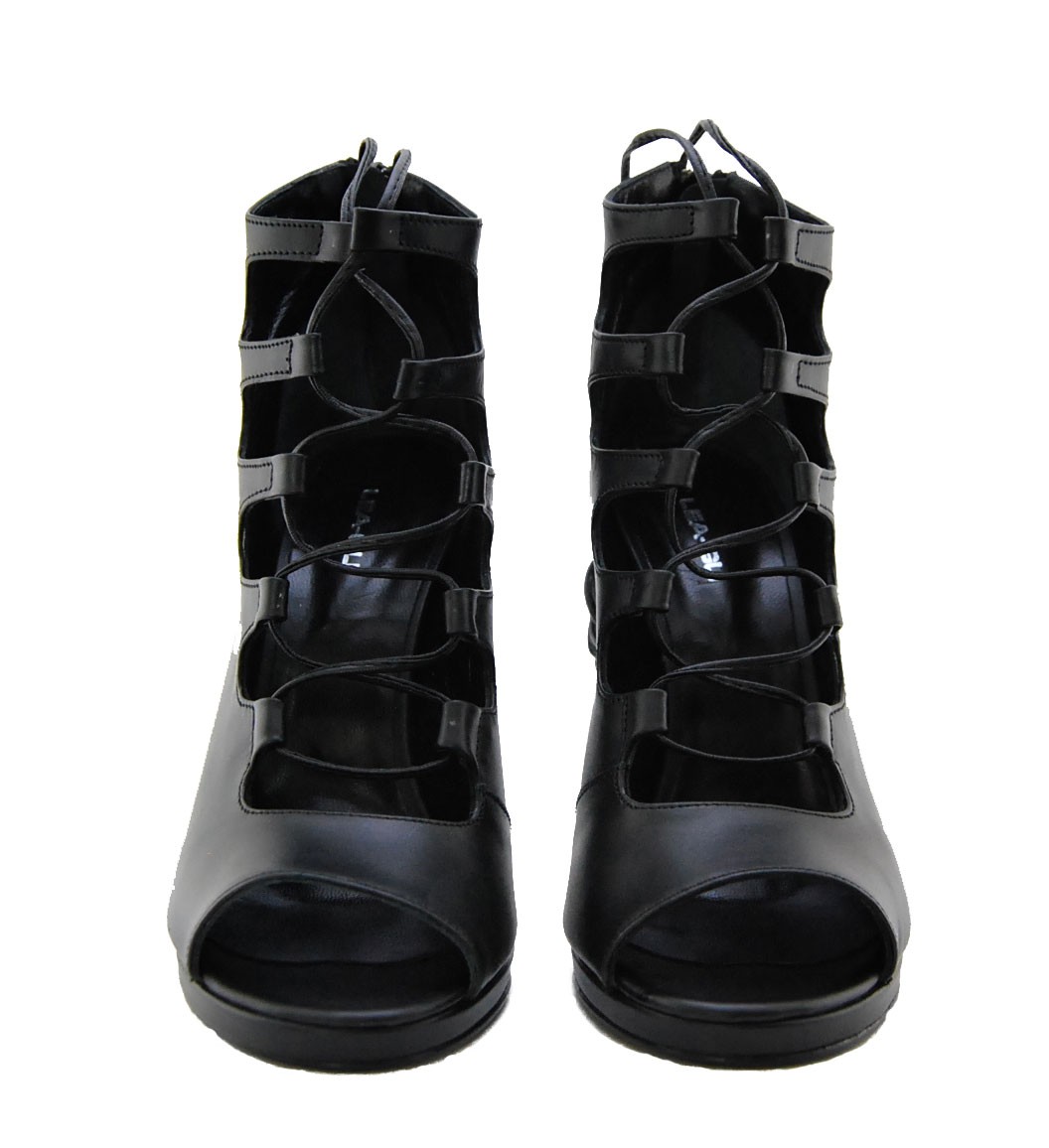 Negro sandalia con tacón Lea Do cordones en cuero.La piel que cubre el pie hasta tobillo de salir de él y descubrió que el apareció y la parte posterior del pie donde se entrelaza una cadena de cuero negro que llega hasta por encima del tobillo y puede ser fijado tanto el arco en frente es el de la vinculación en el tobillo. Lazada con cremallera negro detrás del talón es muy cómodo y rápido.