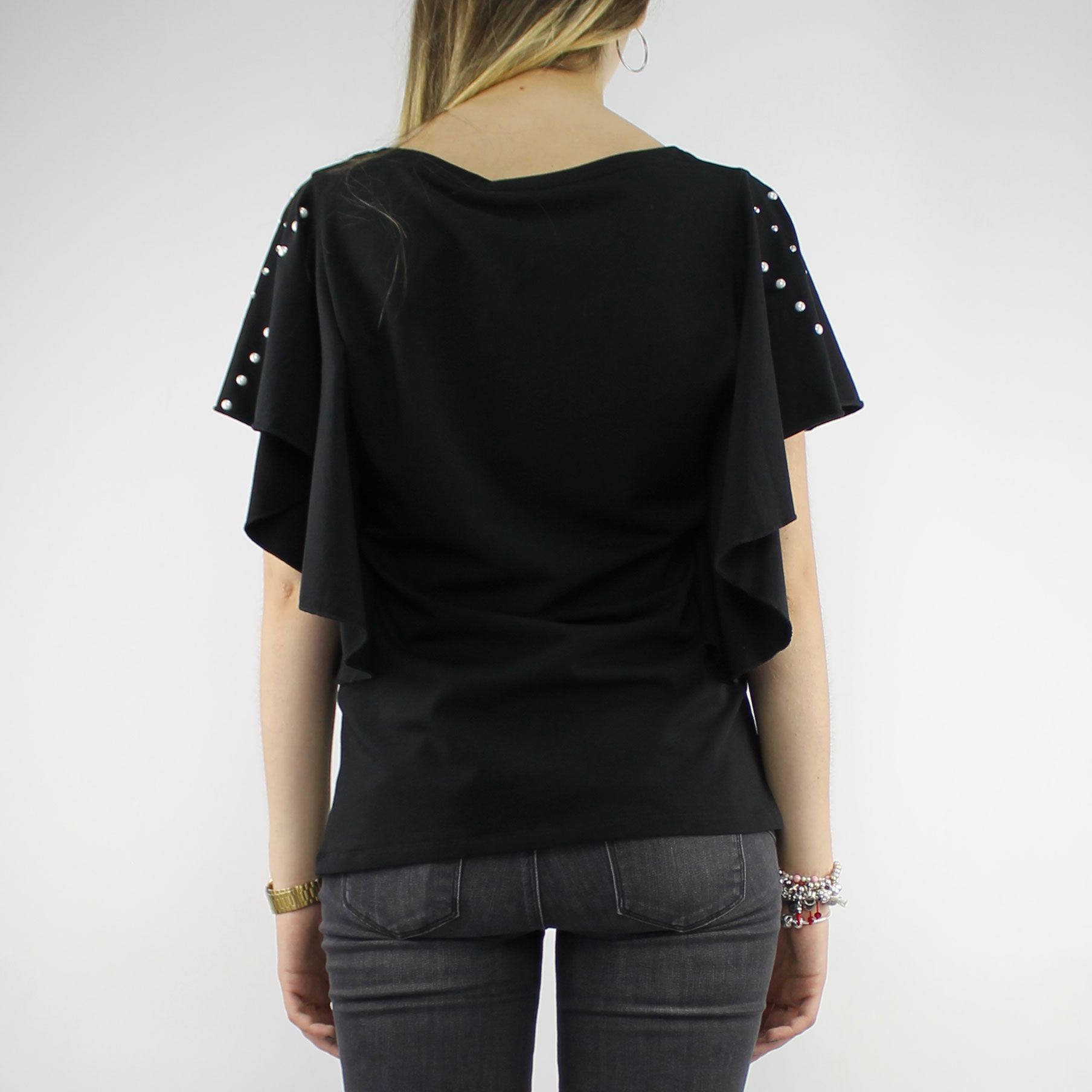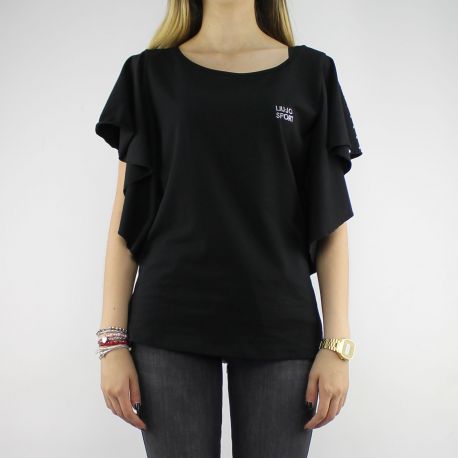 T-Shirt de Liu Jo Deporte negro jersey de algodón con volantes, adornado con micro perlas y puntos de luz.