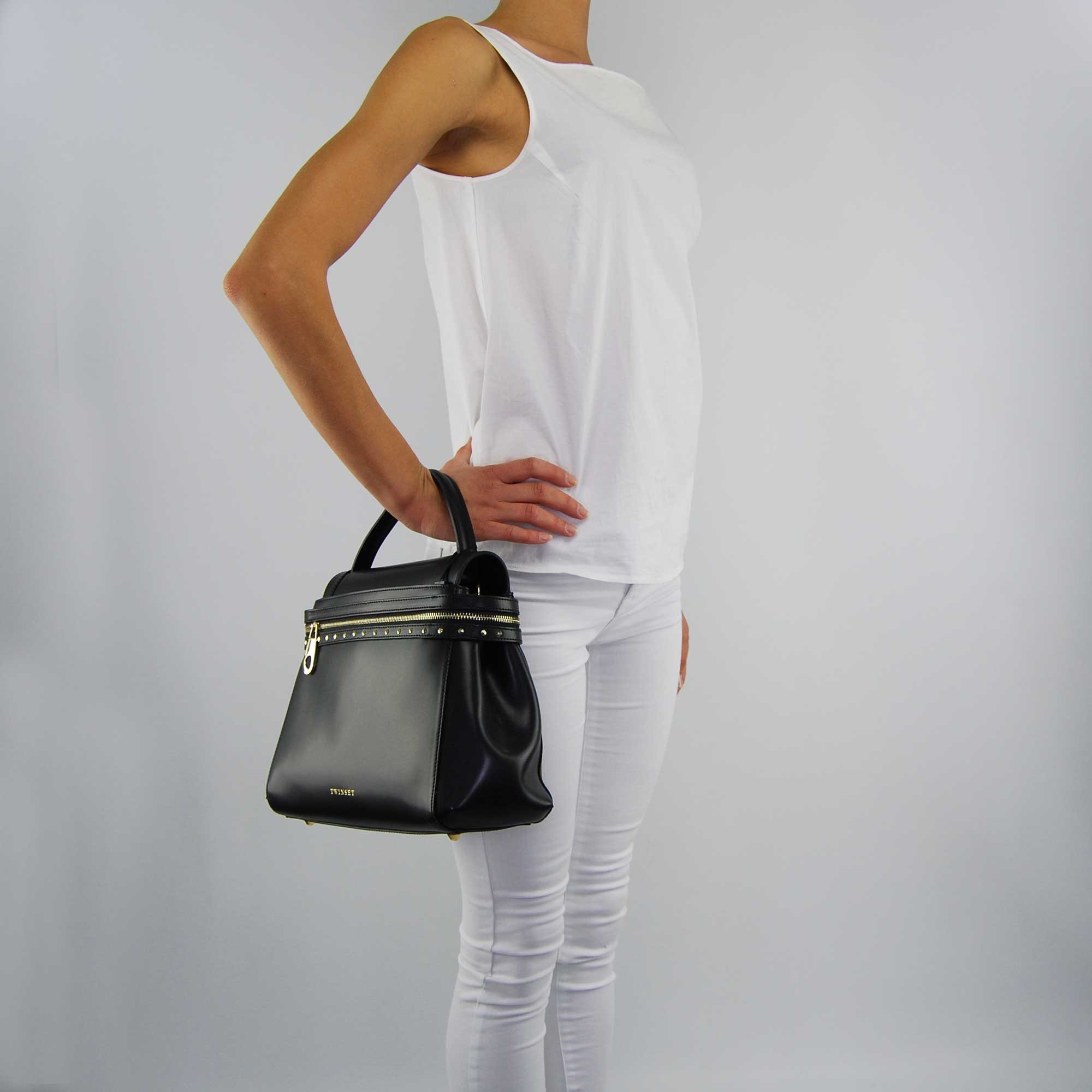 Bolso satchel de Twin-Set Cécile Deux de piel de becerro anti-arañazos, con una correa de hombro desmontable. Solapa de cierre y oculto de botón magnético y bolsillo con cierre de cremallera en color oro. La aplicación de pequeñas vigas de oro a lo largo de la cremallera de cierre, pin color del oro, y el logotipo de la Doble Conjunto de impresos. Los pequeños bolsillos de almacenamiento interno, forro interior de color rosa claro. Bolsa de proteger del polvo, incluyendo el original.