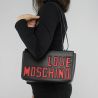 Sac à bandoulière marque Love Moschino en cuir artificiel noir. Le logo de la marque, rouge bordé de noir, est appliquée sur la face avant, et pendant presque toute son extension. Fermeture avec rabat magnétique et de boutons; les demandes d'argent. L'intérieur dispose d'une poche de rangement et une doublure en tissu rouge. Sac de protéger de la poussière, y compris l'original.