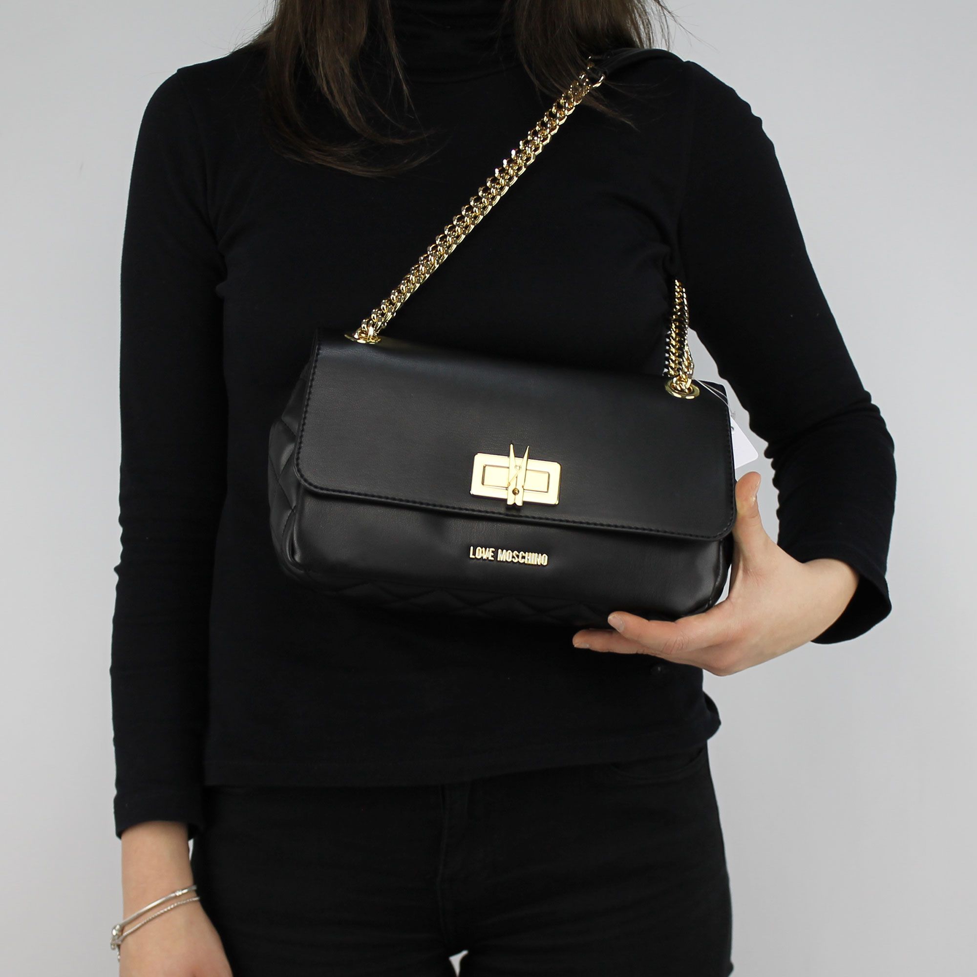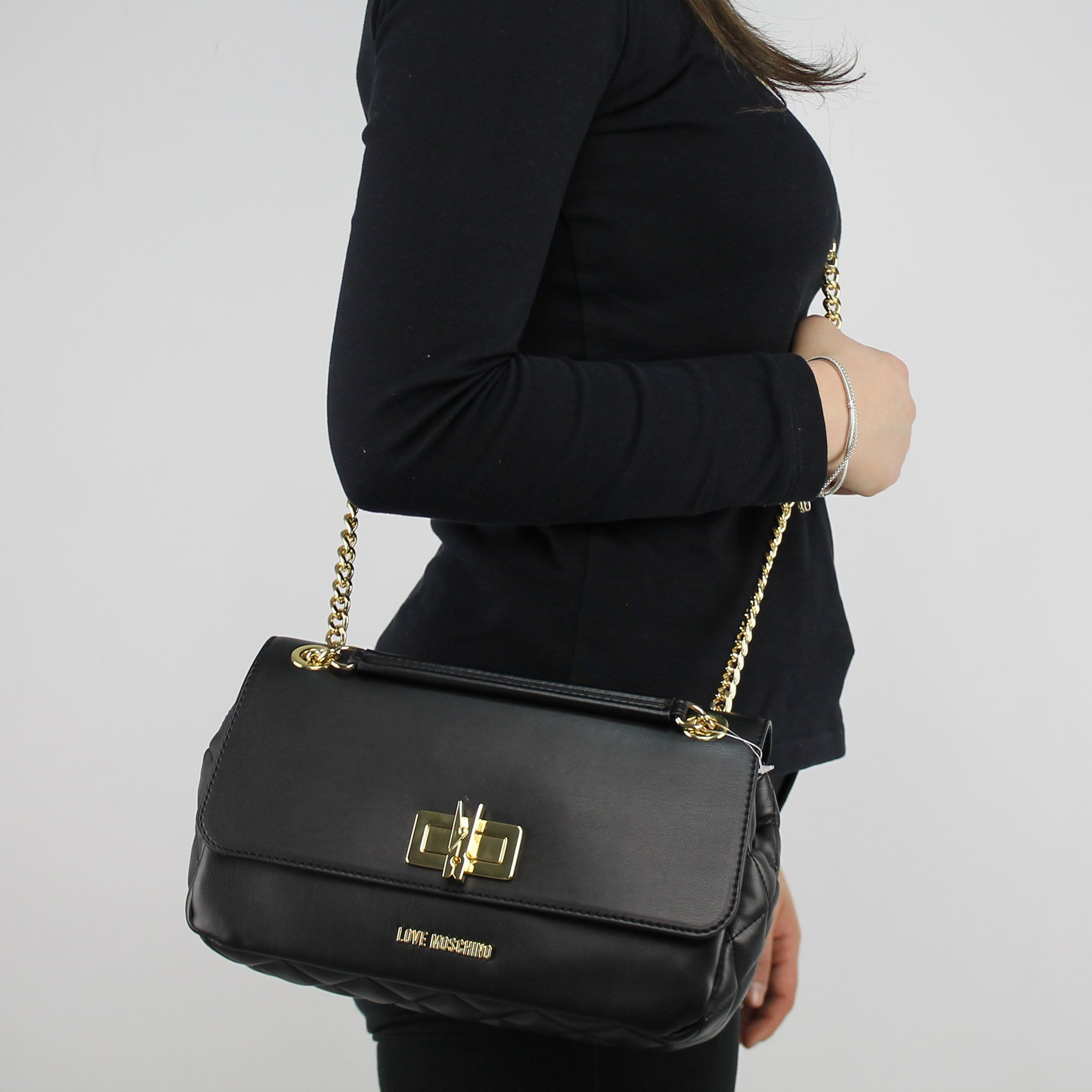 Sac à bandoulière marque Love Moschino en cuir noir lisse avant et à l'arrière, et tissu matelassé sur les côtés.