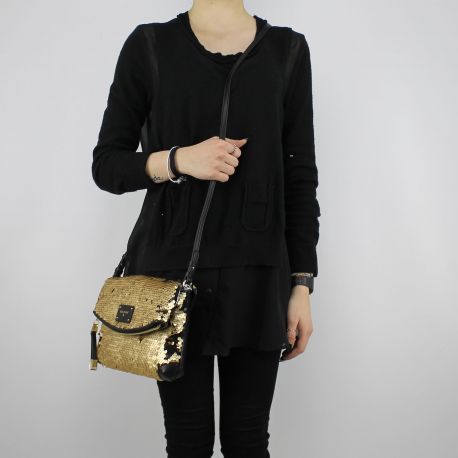 Sac à bandoulière Patrizia Pepe en or et paillettes noires. Le sac est entièrement recouvert de paillettes de couleur or et noir, et Les paillettes, si on les laisse dans la position naturelle et de donner un aspect esthétique est assez uniforme dans la couleur de l'or, s'il se tourne vers le plaisir, créer un effet esthétique moins uniforme mais plus excentriques, donc en alternance avec des taches de paillettes d'or et des plaques de paillettes noires. Comme vous pouvez le voir sur les photos, il est possible de créer des modèles personnalisés. Pour déplacer les paillettes à votre goût juste de passer au-dessus de la main, et il sera possible de créer l'effet que vous aimez le mieux. Dans les coins inférieurs de la tracollina il y a deux taches de noir de cuir synthétique, que la rupture esthétique, l'effet des paillettes, de la couleur des murs de la sangle et de toutes les autres finitions. Le sac a une sccomparto principal sous rabat fermeture,spacieux, avec diverses poches avec fermeture à glissière; Une scoparto le secondaire est à l'intérieur de la fermeture à glissière sur la fin de la trappe. La ceinture de la bandoulière est réglable en longueur. Le sac est à l'intérieur doublé avec du tissu noir. Dans la partie avant, entre les paillettes, il y a le logo de Patrizia Pepe. Le sac est fourni avec un sac de protéger de la poussière de l'original avec l'impression du logo Patrizia Pepe.