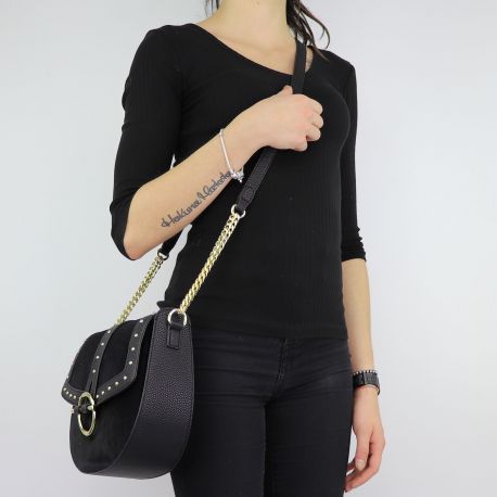 Sac à bandoulière Liu Jo noir de velours et de faux empiècements de cuir. L' sangle d'épaule de style vintage et très chic, il est sécurisé par rabat avec bouton magnétique sur laquelle sont placés les micro-goujons en métal doré, velours, inserts de de couleur noir et de la fausse crochet qui embellit encore plus le sac. À l'intérieur de il est un moyen pratique compartiment avec couverture en tissu bleu, et des poches pratiques, y compris un zip verrouillable. Le Logo de la marque en métal or imprimé sur le côté. Sac de protéger de la poussière, y compris l'original.