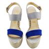 Coin sandale ouverte , bracelet en cuir bleu à l'avant à l'arrière du pied, et le fascia et de la cheville de fixation en cuir gris chiara; fermeture à boucle métal d'or et de coin de corde tressée de couleur crème et de la corde.