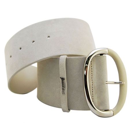 CEINTURE BEIGE EN DAIM BOUCLE EN MÉTAL ARGENTÉ ET BEIGE BREVET PLAC EN MÉTAL ARG LOGO DE PETITS TUTEURS