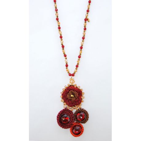 Long collier de pierres dans la matière plastique dans les teintes de marron, or jaune et semi-transparent; 4 dans l'attente de la circulaire connecté avec des applications broderie aux couleurs de rouge bordeaux, de marron et d'orange, trois d'entre eux avec des pierres en plastique rouge ensemble. L'application de perles sphériques du matériau en plastique jaune translucide.