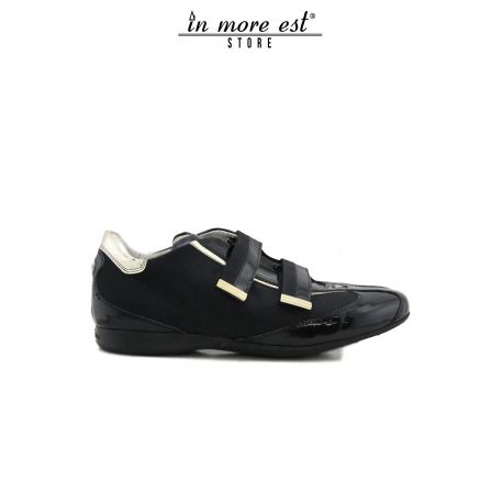 BASKETS BASSES-NOIR BOUT DE TISSU VERNI NOIR COURROIE CÔTÉ DE LA PLAQUE GARDIENS
