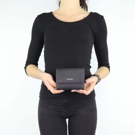 Portefeuille Liu Jo noir effet cuir laine, fermeture à bouton à l' de la pression. Le portefeuille a un rabat de fermeture sur lequel le front il est appliqué pour le lettrage du logo de la marque en métal argenté. Il dispose également d' deux compartiments pour des documents ou des cartes et un scoparto port pour les billets de banque avec doublure revêtement à l'intérieur du carré de l'effet de l'écossais. Sur le dos il ya une poche poche de pièce de monnaie fermé par zip, avec doublure, revêtement, également en tissu le carré de l'effet en ecosse. L'article est vendu avec boîte d'origine.
